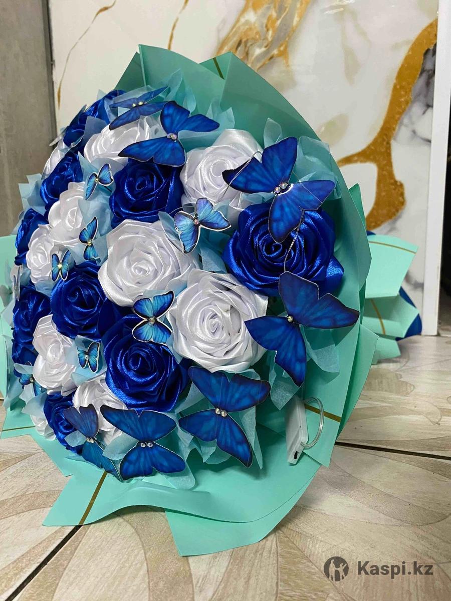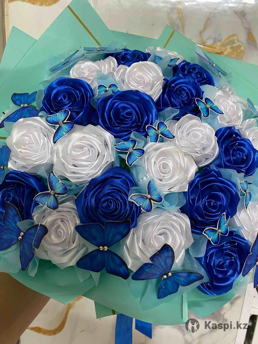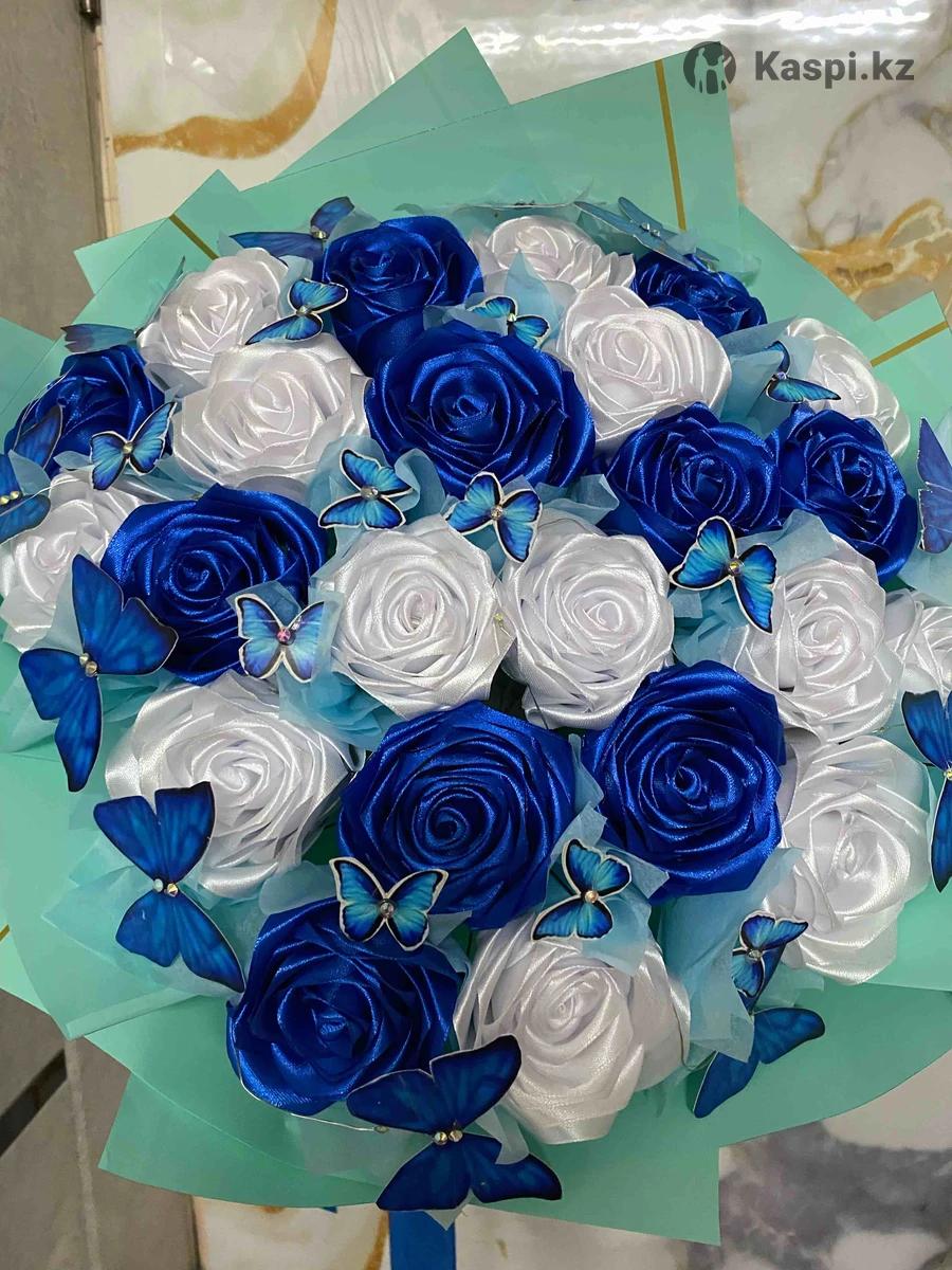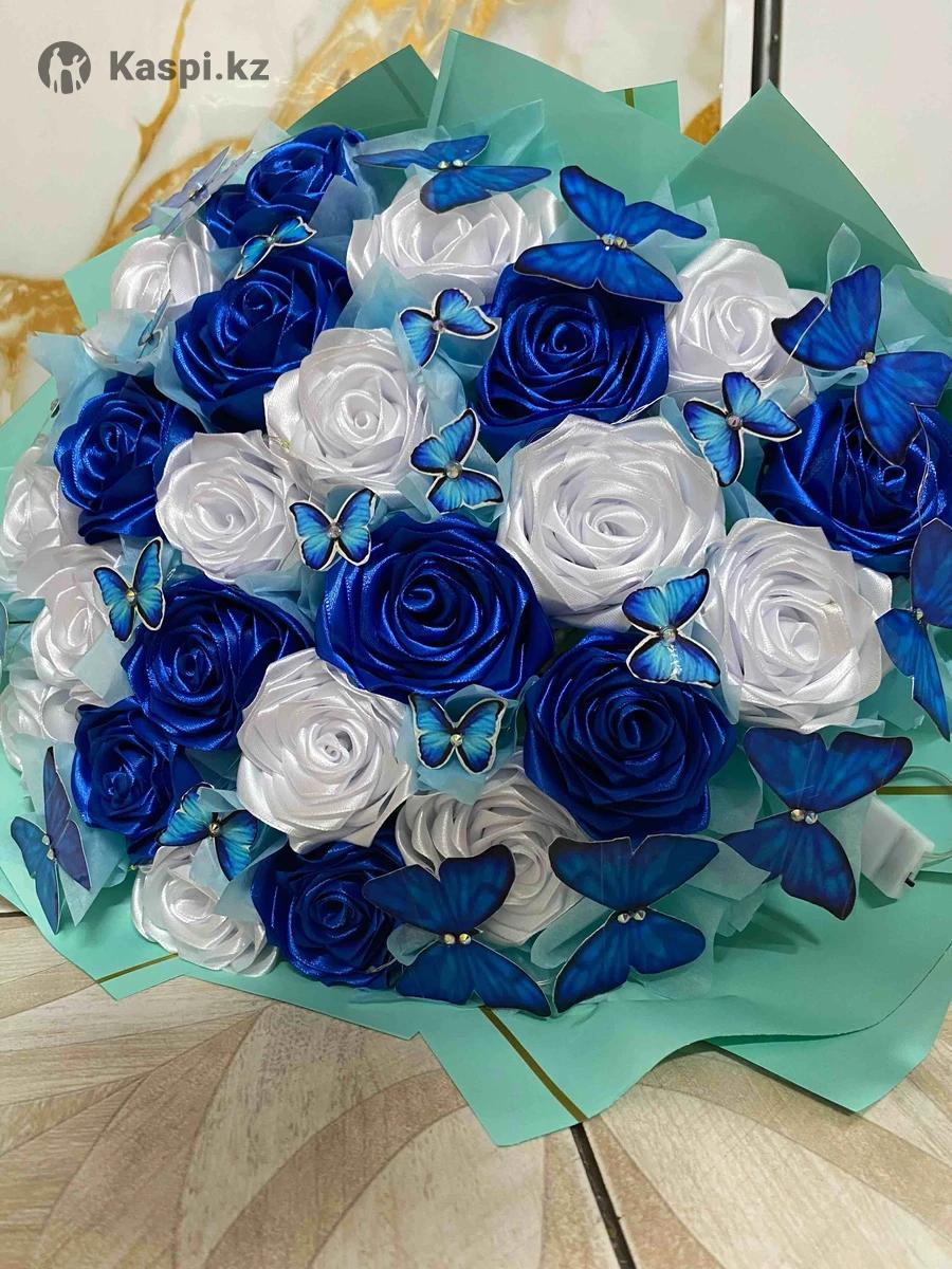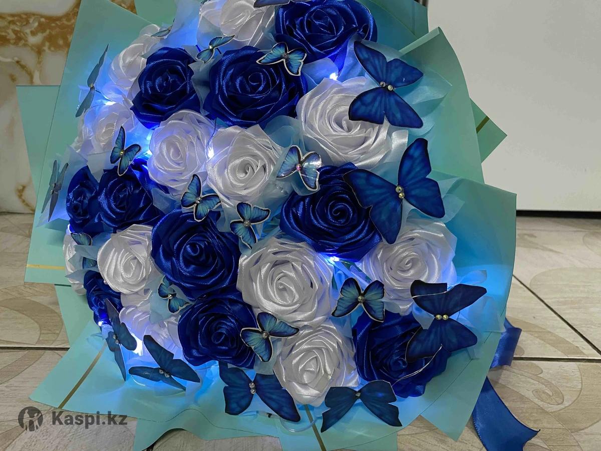 Светящийся букет из ленточных роз .В букете 13 белых и 10 синих роз .В подарок 25 бабочек на букете .