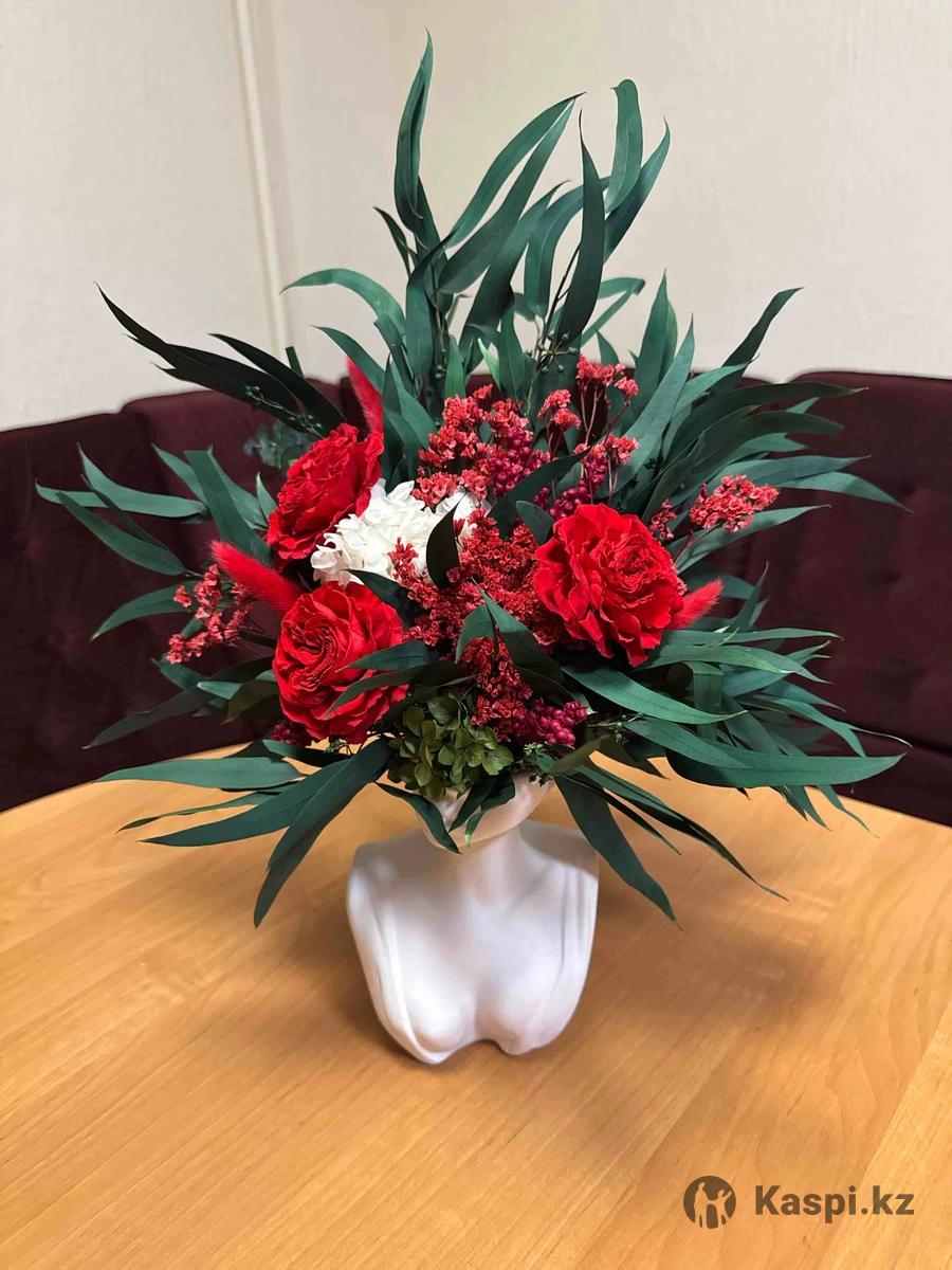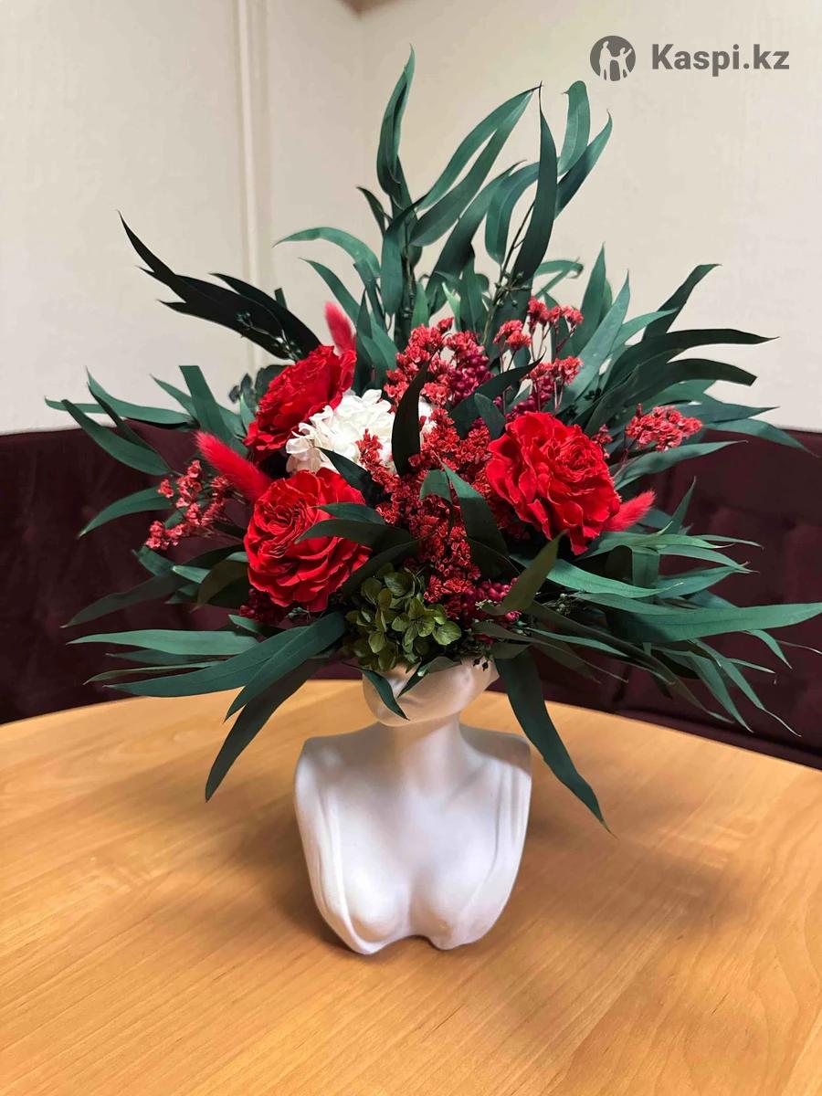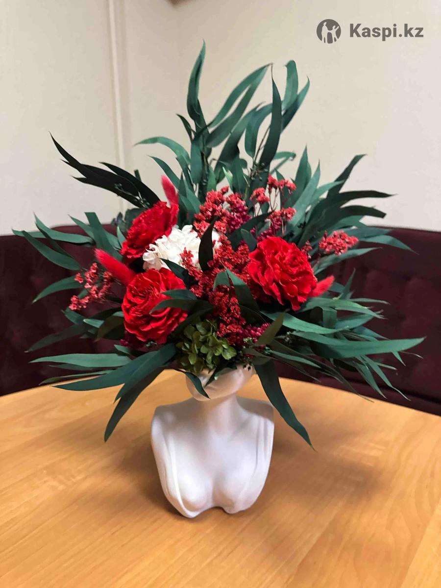 Шикарная композиция из стабилизированных цветов — эстетика, которая остается надолго. Красно-бордовые розы, зеленый эвкалипт и лимониум собраны в изящный силуэт девушки. Эта композиция символизирует женственность, внутреннюю силу и утонченный вкус. Стабилизированные цветы не требуют ухода, не теряют форму и цвет, сохраняя безупречный внешний вид на протяжении нескольких лет. Это не просто цветы — это акцент в интерьере и статусный подарок, который производит впечатление с первого взгляда. Эксклюзивная композиция.
