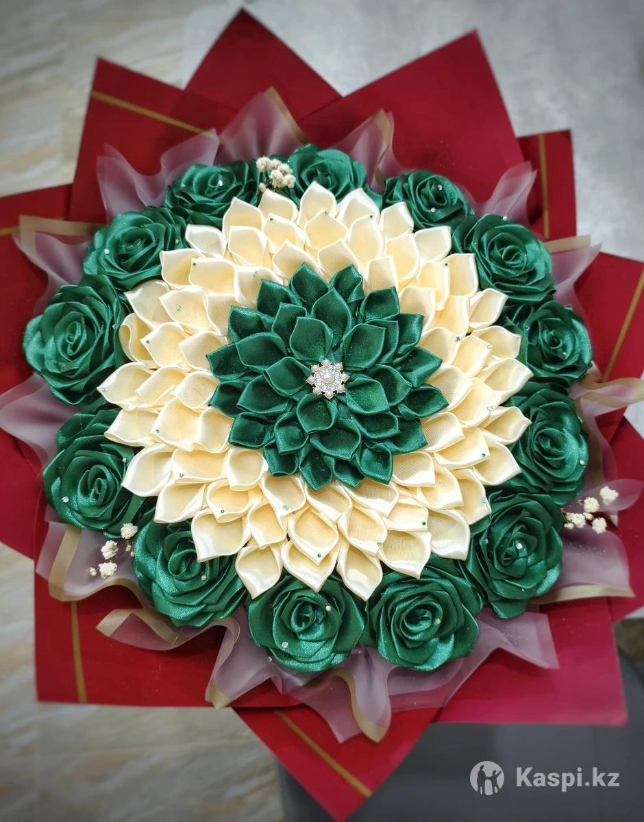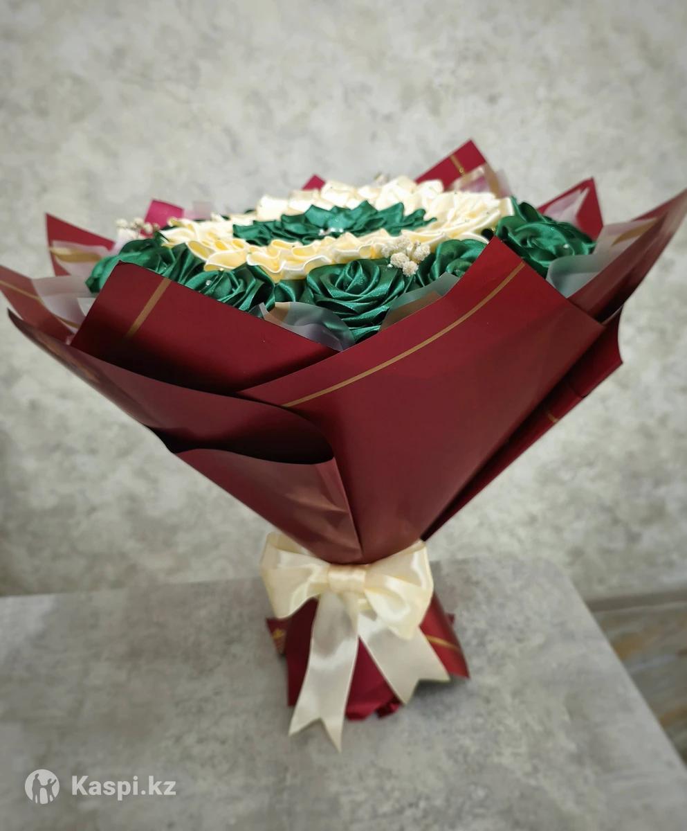 Продам букет из атласных лент. Диаметр без упаковки +-35см, с упаковочной бумагой +-47см. Высота +-40см.