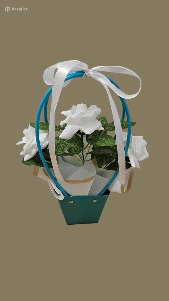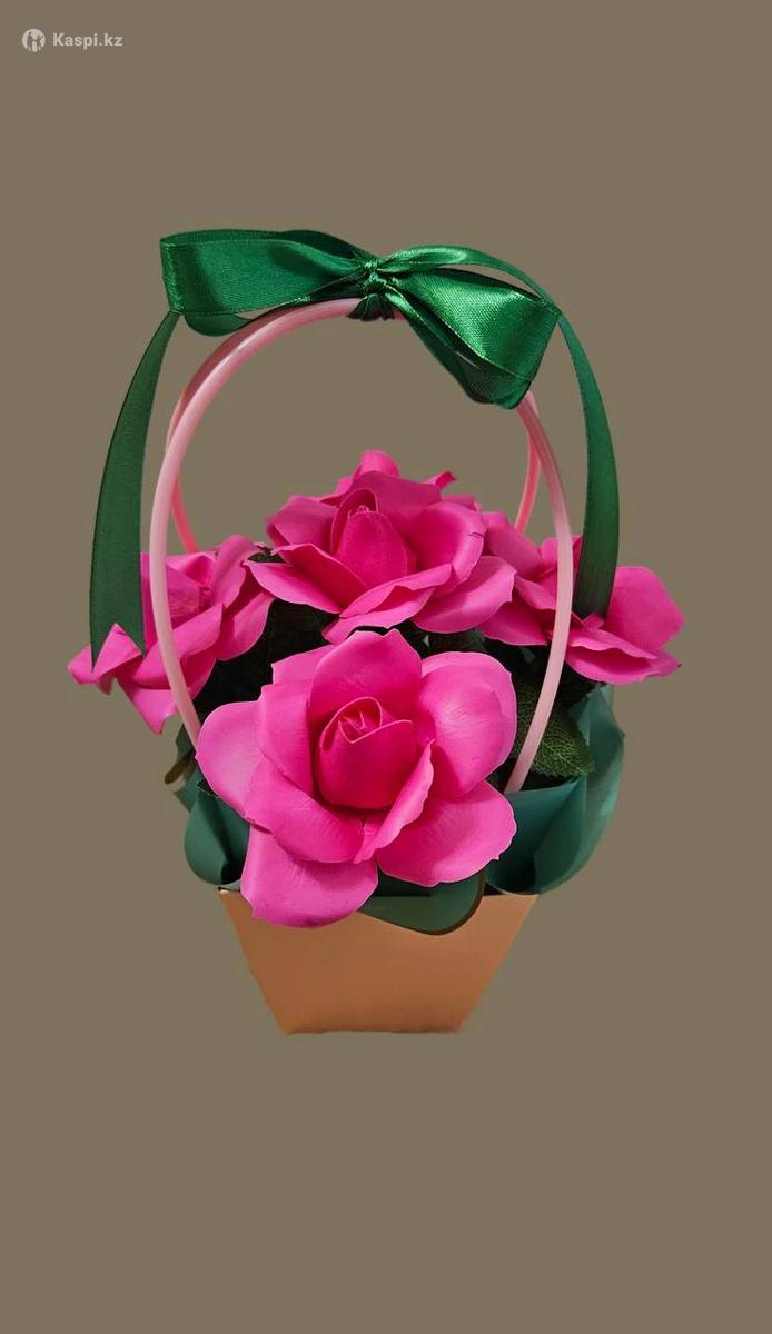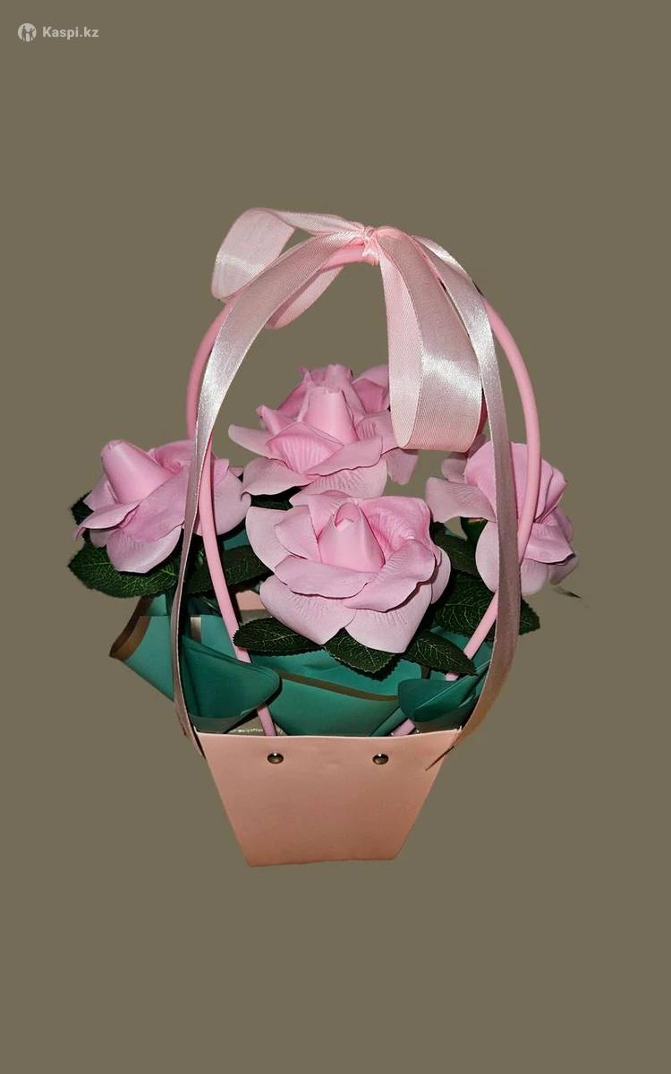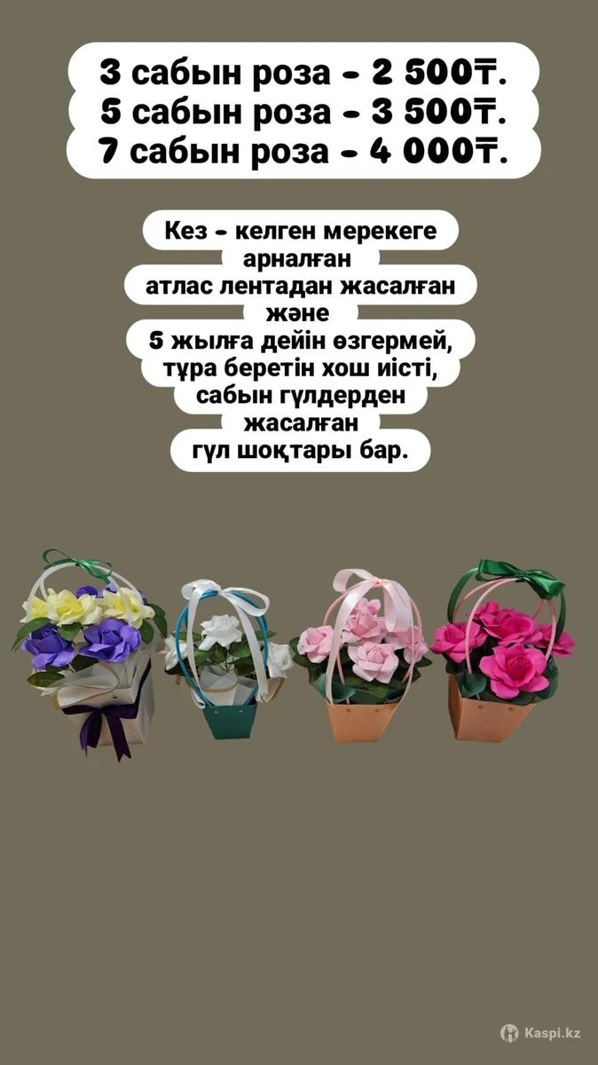 Кез - келген мерекеге арналған атлас лентадан жасалған және 5 жылға дейін өзгермей, тұра беретін хош иісті, сабын гүлдерден жасалған гүл шоқтары бар.