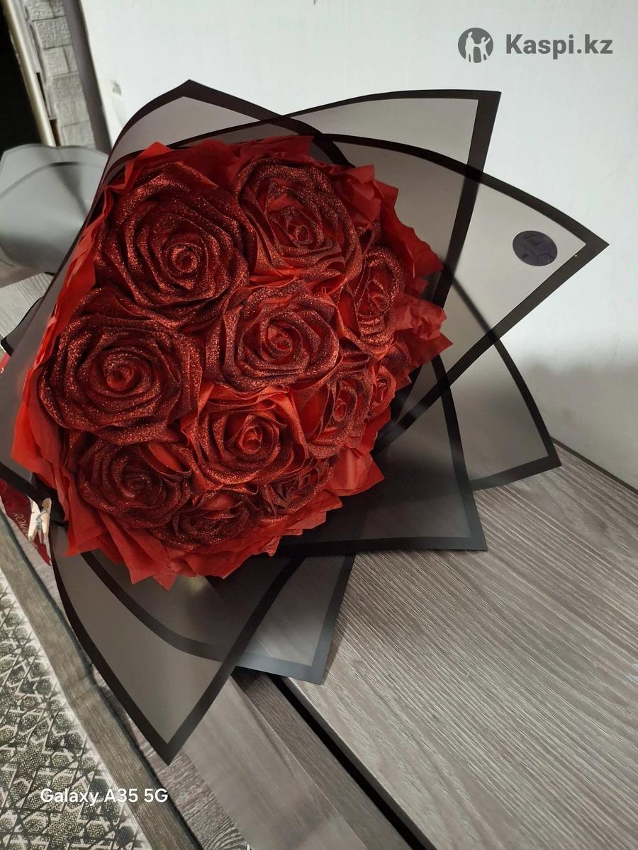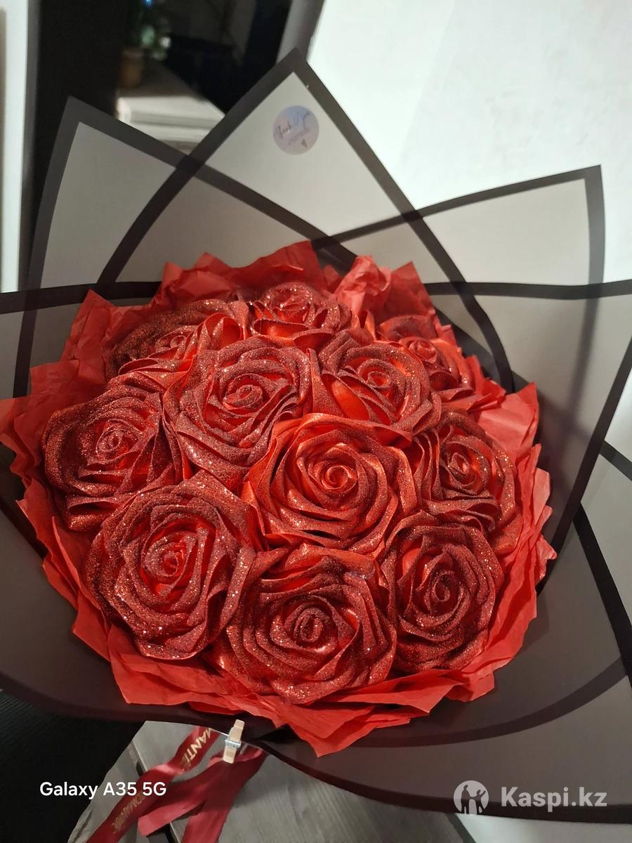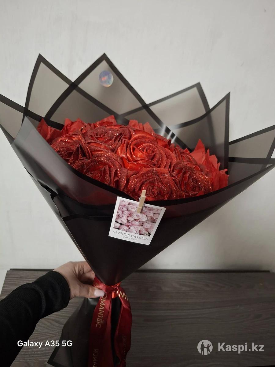 Букет декоративных красных роз ручной работы из атласной ленты В букете 11 роз с блеском Букет продаю по акции со скидкой -35% 8 марта- это праздник в который нужно удивлять такими букетами! Для мамы, подруги, теще, жене, учителю, свекрови и т.д К букету будет небольшой подарок-презент!