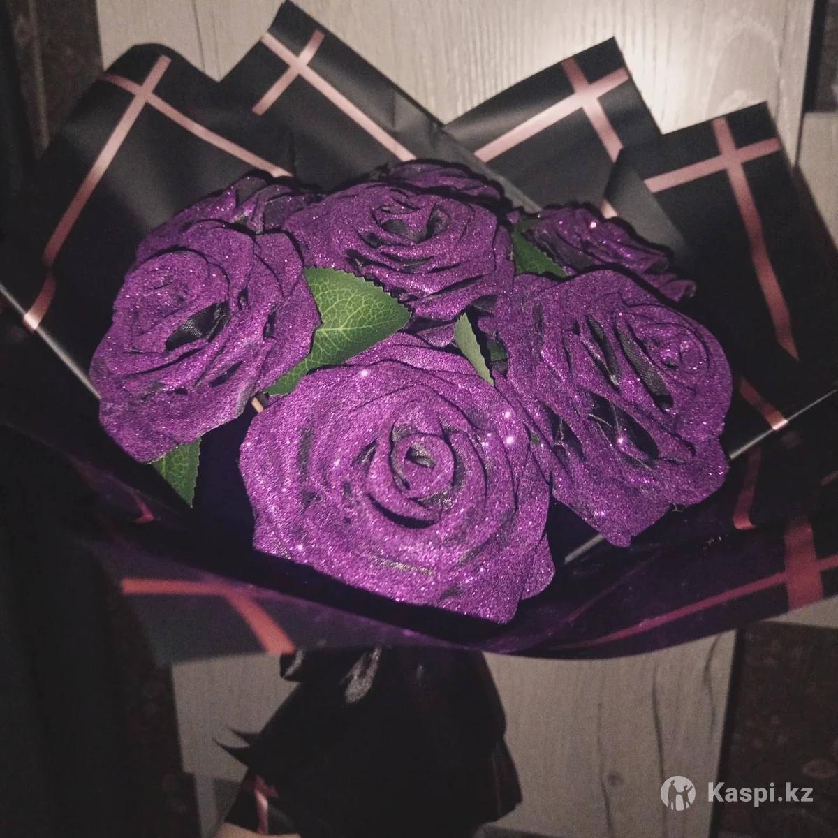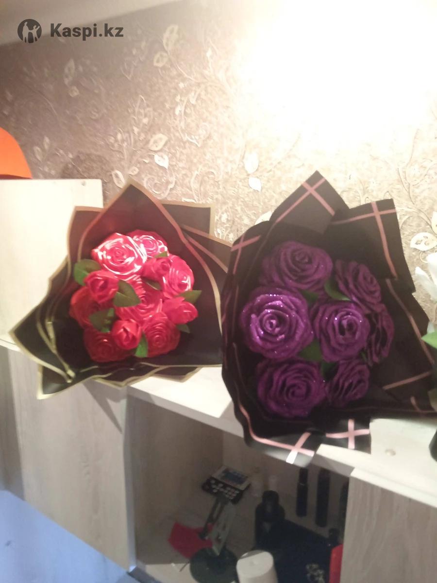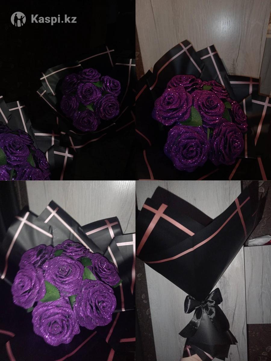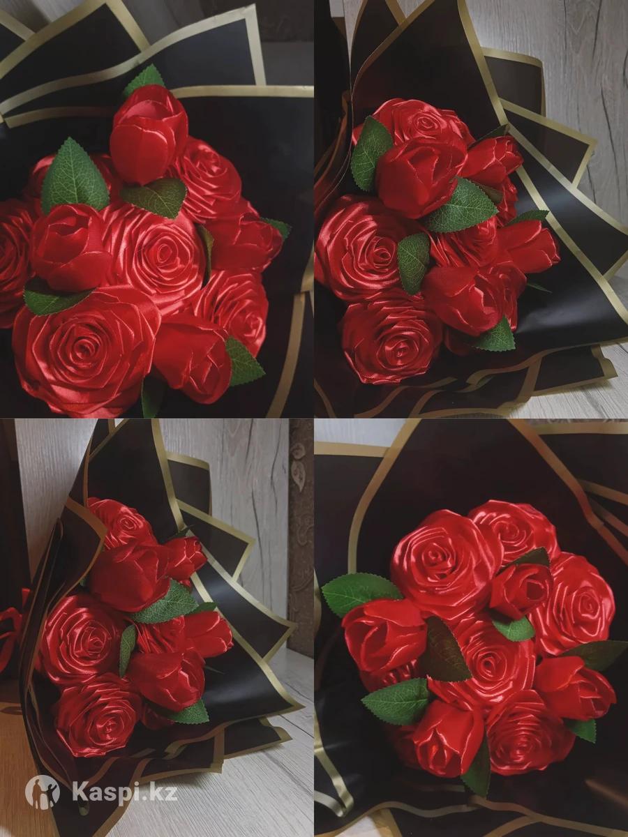Букеты из атласных роз на заказ подарок который никогда не завянет. В наличии есть красный-там 4 тюльпана и 7 роз в общем 11-6500тенге Фиолетовый 7 роз покрытые блёстками - 5000тенге