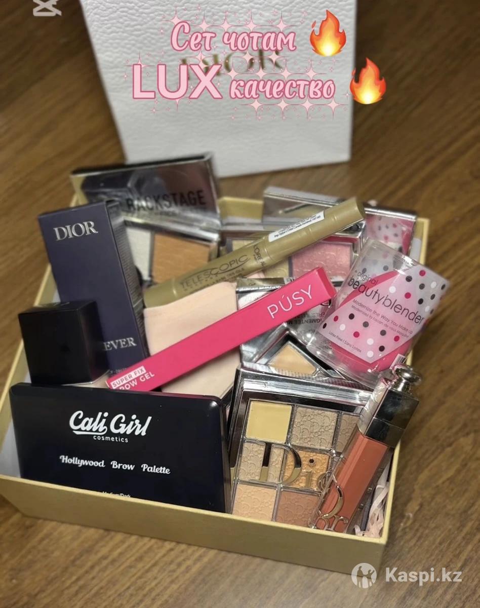 В набор входит: •Хайлайтер (в люксовом дизайне)диор •Румяна (нюдовые оттенки)диор •Блеск для губ диор •Палетка теней для век диор •Тональный крем диор •Гель для бровей пуси •Тушь для ресниц с эффектом объема телескопик •Бронзер гуччи •Спонж для макияжа •Палетка для бровей кали герл