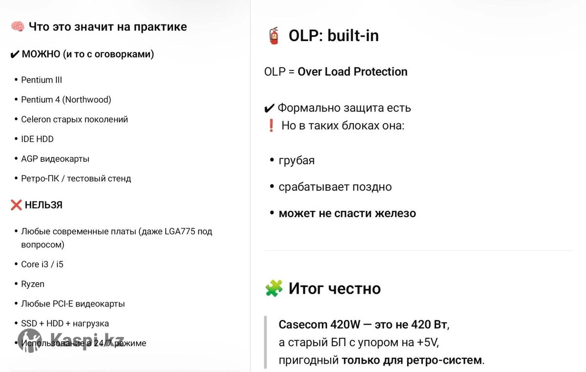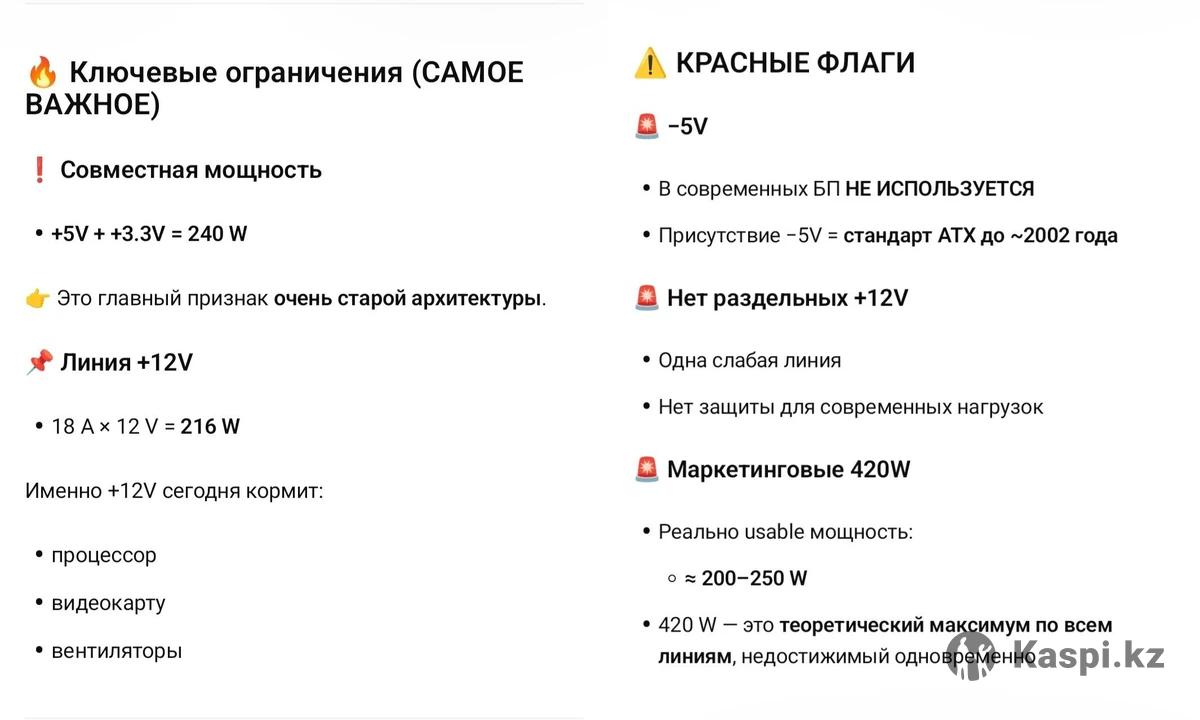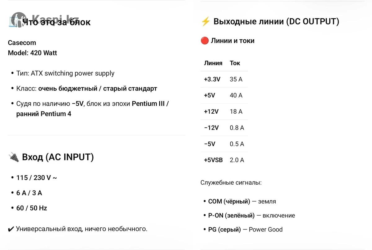 Продам блок питания для персонального компьютера: Название: Casecom Model: 420 Watt Тип: Импульсный источник питания ATX Класс: очень бюджетный / старый стандарт Судя по наличию −5V, блок из эпохи Pentium III / ранний Pentium 4 Полная характеристика в фотографиях. Цена договорная, обмен на другие товары не рассматриваю, доставку по городу Алматы сделаю за свой счет.