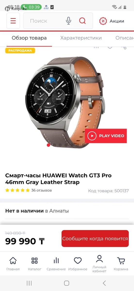 Продаю новые смарт часы Huawei GT3- 3B1, не пользовались, коробку с зарядкой не могу найти, поэтому продаю за 50000 тенге.