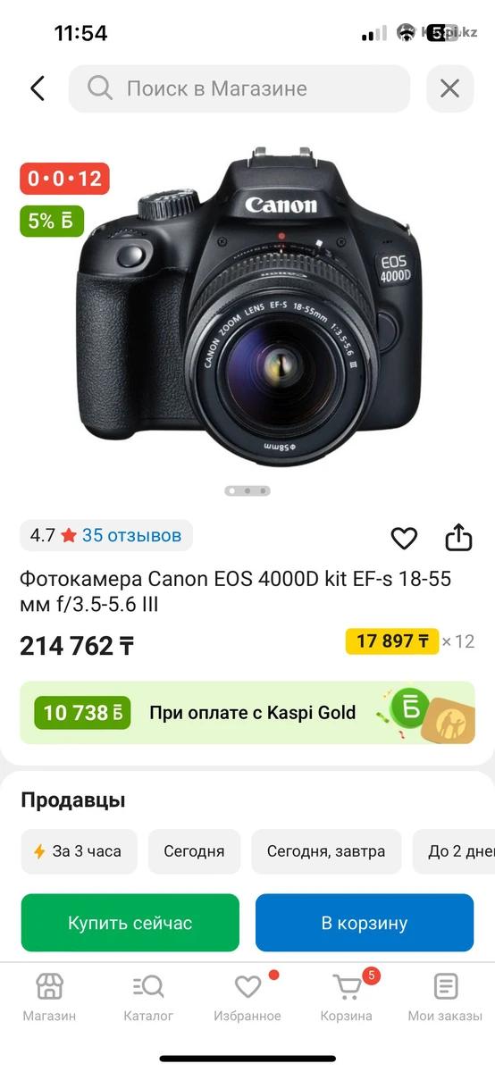 Canon EOS 4000D Kit 18-55mm Сыйлыққа берілген, өте жақсы жағдайда. Сирек қолданылған. Толық жұмыс істейді. Қорабы мен зарядкасы бар. Сапасы жақсы, бастаушыларға ыңғайлы. Қорабы зарядкасы бар Қаласаңыз sd карта сыйлыққа беремін.