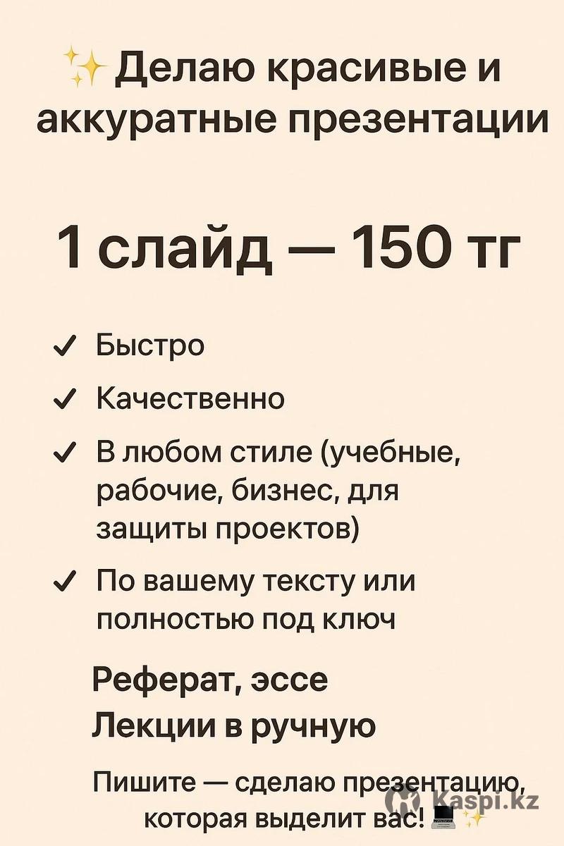 1 слайд — 150 тг 📌 Быстро 📌 Качественно 📌 В любом стиле (учебные, рабочие, бизнес, для защиты проектов) 📌 По вашему тексту или полностью под ключ Пишите — сделаю презентацию, которая выделит вас! 💻✨