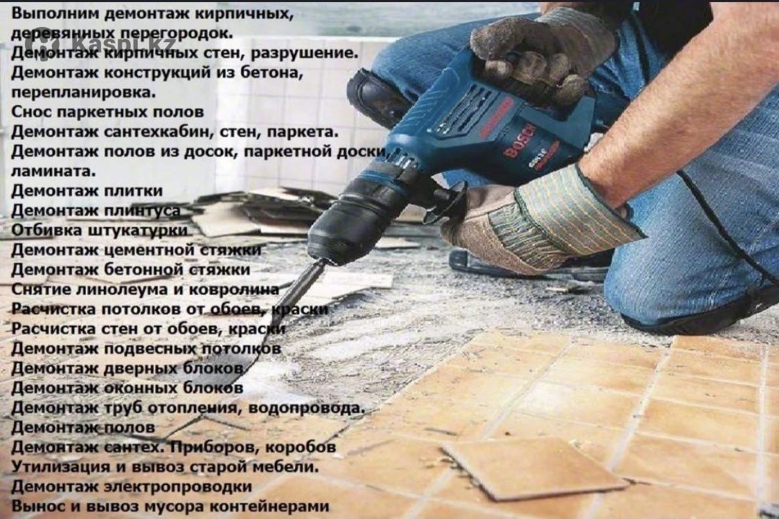 Демонтажные работы и вывоз мусора. Последствием любых работ ремонтного характера является возникновение различного рода отходов, которые, конечно же, стоит надлежащим образом утилизировать. В наибольшей степени это касается работ по демонтажу, так как они автоматически означают появление большого количества строительного мусора. Демонтажные работы Любой сколько-нибудь серьезный ремонт квартиры или дома требует работ демонтажного характера. Это относится не только к косметическому ремонту, но и к перепланировке, и замене мебели и соответствующего оборудования. Также без соответствующих работ по расчистке территории невозможно начать новое строительство. демонтажные работы В спектр демонтажных работ входят такие услуги: Демонтаж старых построек, разрушение фундамента; Очистка площади под новое строительство; Снос стен; Демонтаж перекрытий и перегородок; Работа с дверными или оконными проемами (Расширение уже существующих или создание новых); Снятие полов; Демонтаж паркета или ламината; Демонтаж облицовочной плитки; Устранение электропроводки; Демонтаж газовых плит и сантехники; Углубление подвалов; Разборка мебели. Работаем по всей Улытауской области.