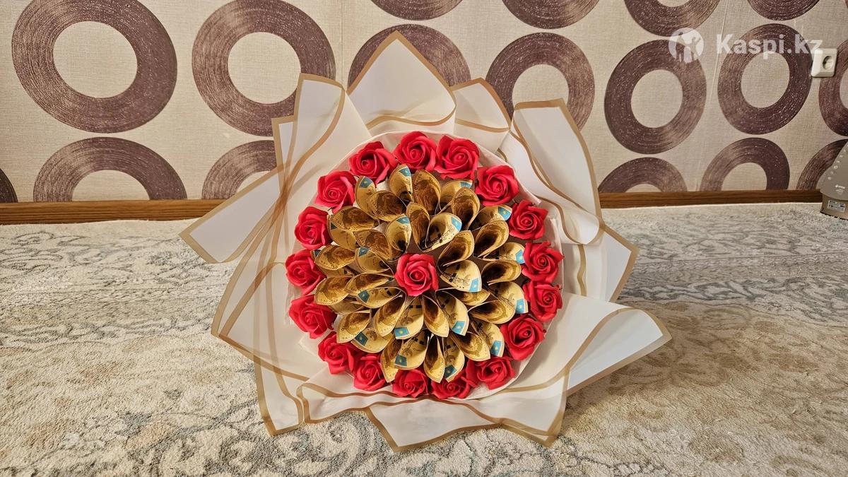 20 000 теңгеден және 17 хош иісті сабын гүлден құралған гүл шоғы. Гүлдер солмайды, түсін жоғалтпайды, 5 жылға дейін сақталады. Кеуіп қалса, булап алу керек, қайтадан жұмсарады.