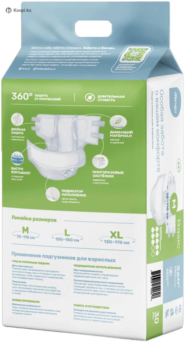 Предназначение: для взрослых, при нарушении контроля мочеиспускания, недержании — для комфортного и гигиеничного использования. Характеристики Размер M — средний (обхват в районе талии/бедер ориентировочно средний, подходит взрослым с обычной фигурой). Форма: одноразовые подгузники (трусики / памперсы) для взрослых. Универсальные: могут использоваться как мужчинами, так и женщинами. Подгузники Deneu Basic M — подойдут: - людям со средней степенью недержания, - пожилым или малоподвижным людям, - в случаях, когда требуется надёжная защита и удобство, - для стационарного ухода или временного использования.