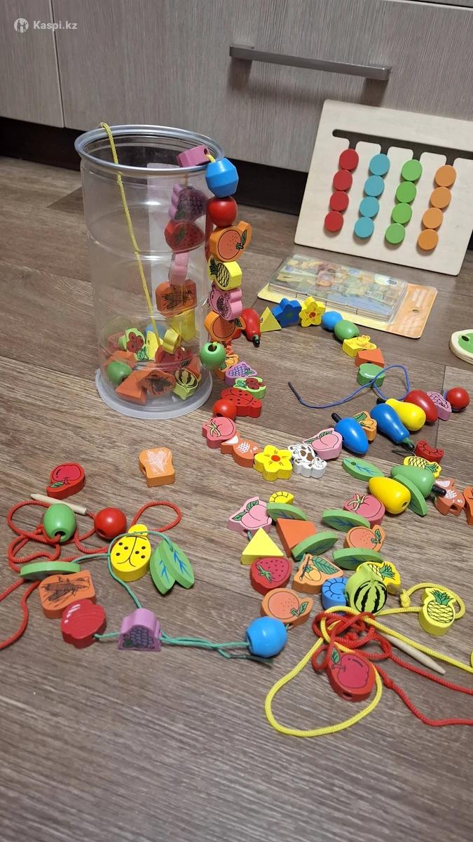 Яркие, развивающие, деревянные игрушки для для малышей: – пазлы-вкладыши с удобными ручками, – ксилофон в форме динозавра, – шнуровки с фруктами и овощами (несколько наборов), – счеты в виде зайчика, – слайдер (собери по цветам или отсортируй по животным), – пазлы 4 вида (новые), – пазлы вкладыши цвета-фигуры, – обучающая доска с цифрами, овощами, фруктами, транспортом и членами семьи. Все игрушки из дерева, развивают мелкую моторику, внимание, память, координацию внимания и логическое мышление. Отлично подойдут для малышей от 1 до 5 лет. Состояние очень хорошее, все чистое и аккуратное. Смотрите другие мои объявления. Много разных интересных предложений как для деток так и для взрослых. Можно писать на .