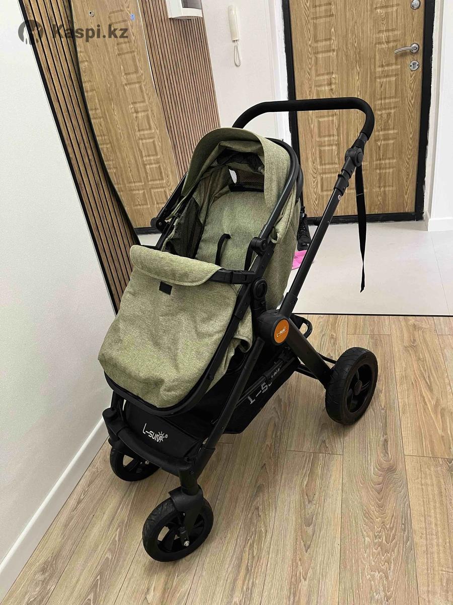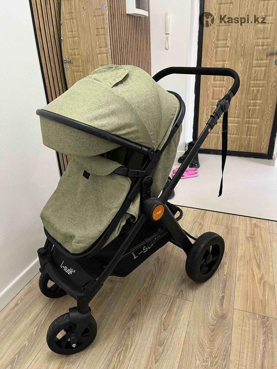Коляска L-sun - коляска-трансформер 2-в-1, сочетающая люльку и прогулочный блок, с водоотталкивающей тканью и вентиляцией, имеющая регулируемую спинку/подножку, 5-точечные ремни, перекидную ручку, большую корзину и складывающуюся раму. Колеса съемные, передние поворотные. Только осенью несколько раз пользовались, почти что новая стоит.