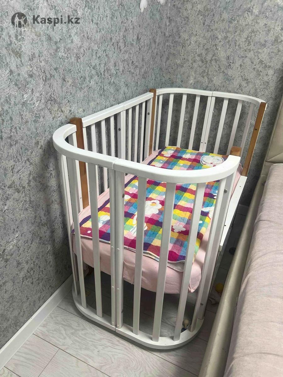 Кроватка - Трансформер 5 В 1 Nuvola Lux с маятником, подходит от рождения до 3-х лет .в подарок отдам 2 ортапедических матраса. Колыбель кроватки имеет размер 84 на 60 см. Далее кроватка трансформируется в овальную 120 на 60 см. Стойки кроватки выполнены из массива натурального бука твердых пород дерева. · Кроватку можно трансформировать в манеж и диванчик для подросших малышей. · Кроватку можно установить на маятник поперечного качания для укачивания малыша. · В комплекте с кроваткой идут колеса для удобного перемещения по комнате.