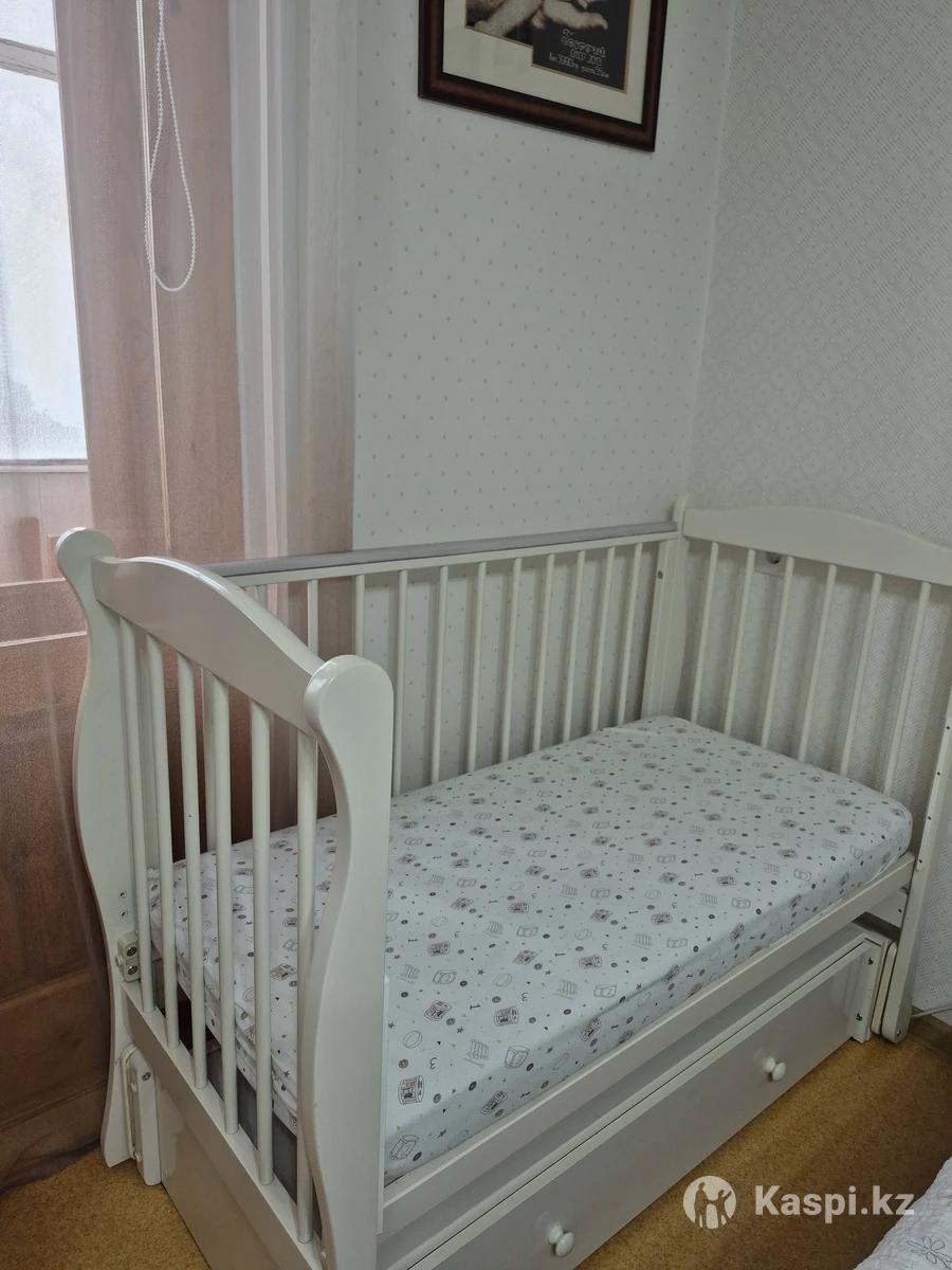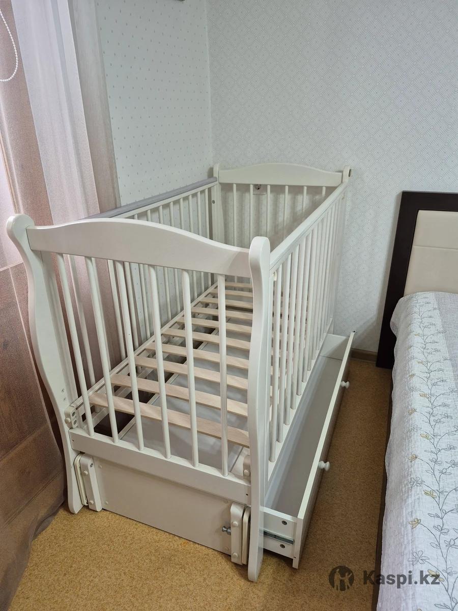 Кроватка детская российской фабрики "Красная звезда". Имеется маятниковый механизм, ложе кроватки регулируется по высоте в двух положениях. Боковое ограждение опускается и снимается. Закрытый глубокий ящик для хранения детских принадлежностей и игрушек. Материал - древесина. Состояние хорошее. Есть матрас (с одной стороны из кокосовой стружки) с клеенчатым наматрасником и три простыни с резинкой, все в хорошем состоянии.