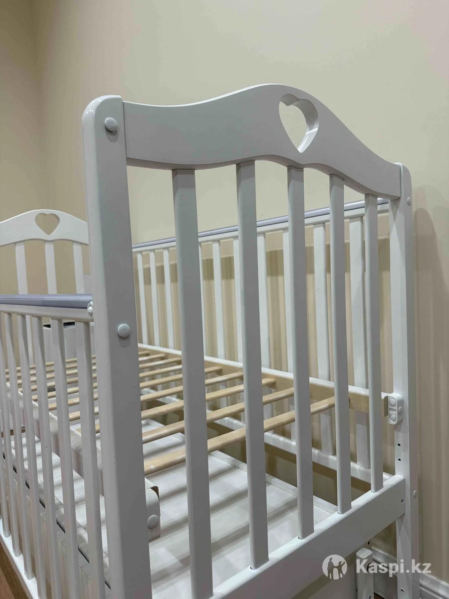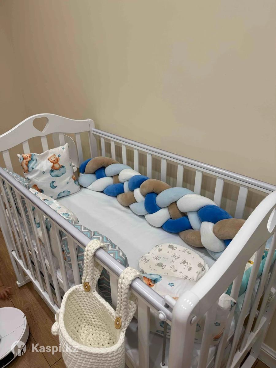 Кроватка размером 12060 по матрасу, в идеальном состоянии. Малыш лежал 3 месяца. Маятник универсальный, т е и поперечный и продольный, можно на стоп ставить. Лежачее место опускается на 2 уровня, также можно убрать переднее основание. Материал дерево. Производство Россия. Есть выдвижная полка снизу для вещей. Силиконовые насадки. Краска на водной основе, безопасен для детей. Отдам с кроваткой: Бортик-подушки 8 шт; Косичка бортик 120 см; 2 ортопедические подушки для новорожденных; Матрас с чехлом и простыней на резинке; Корзинка ручная работа для бутылок и салфеток Район Даму Молл