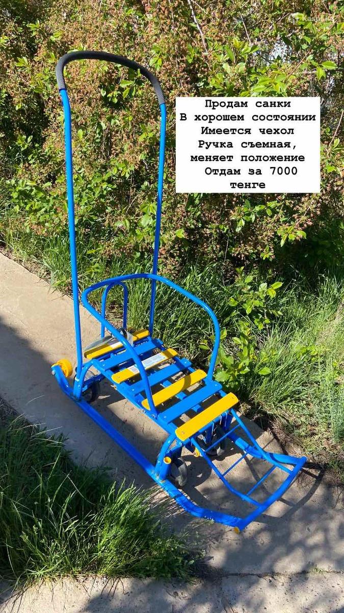 Продам детские санки, с меняющей положение ручкой. Имеется чехол. В хорошем состоянии. Отдам за 7000 тенге.
