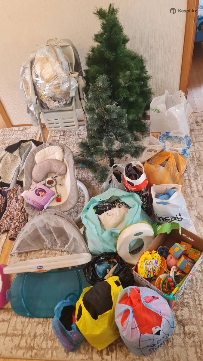 Огромное количество вещей и памперсы и все необходимое и качеля и стульчик для кормления чико и елка как новая так и бу и многое другое забрать срочно таугуль могу передать есть диван