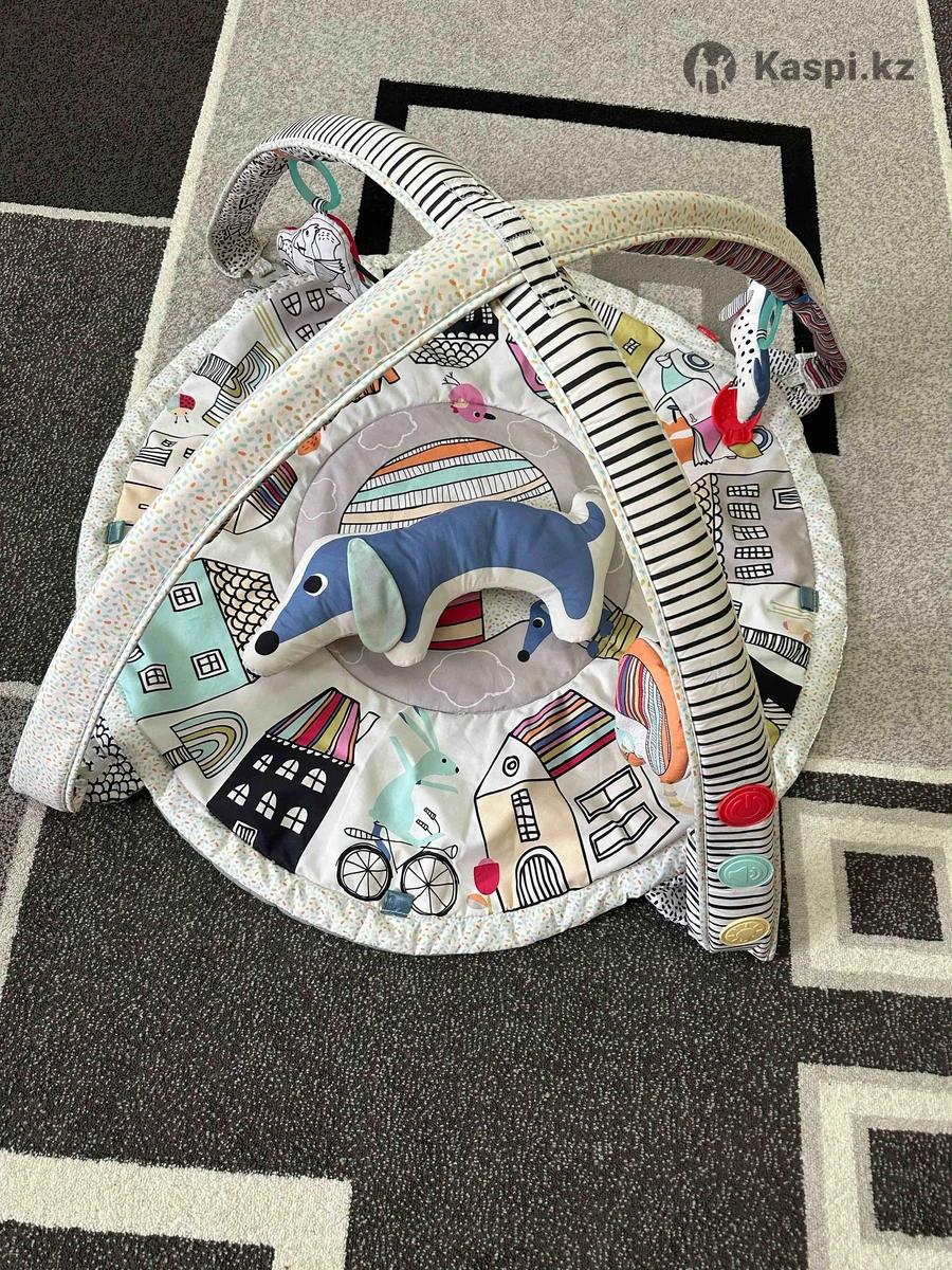Развивающий детский коврик от SKIP HOP с дугами и подвесными игрушками. Оснащён музыкальным модулем с регулируемой громкостью и мягкой подсветкой. Мягкая круглая основа с ярким принтом и подушкой в форме таксы. Подходит для развития моторики, слуха и зрительного восприятия малыша с первых месяцев жизни. Чистый всё работает, можете дополнительно постирать. Все съемное.