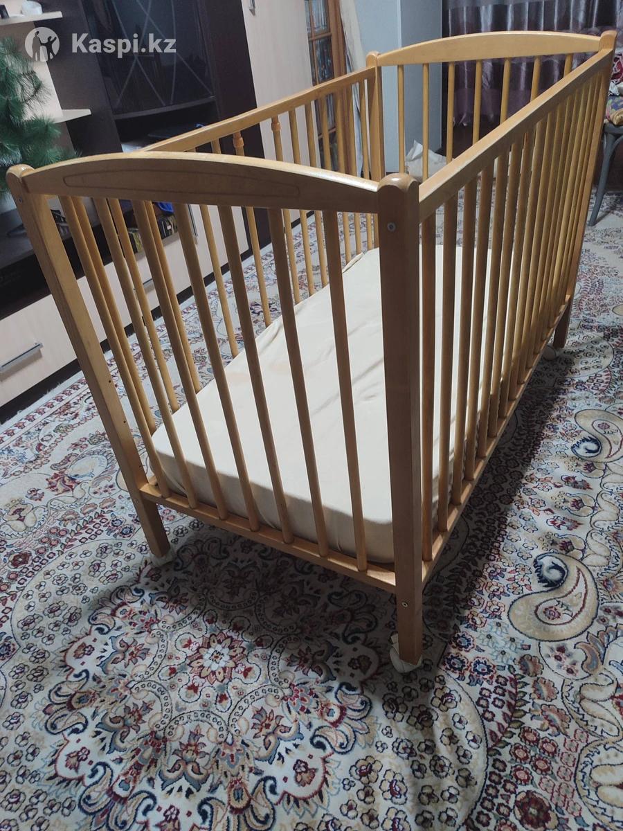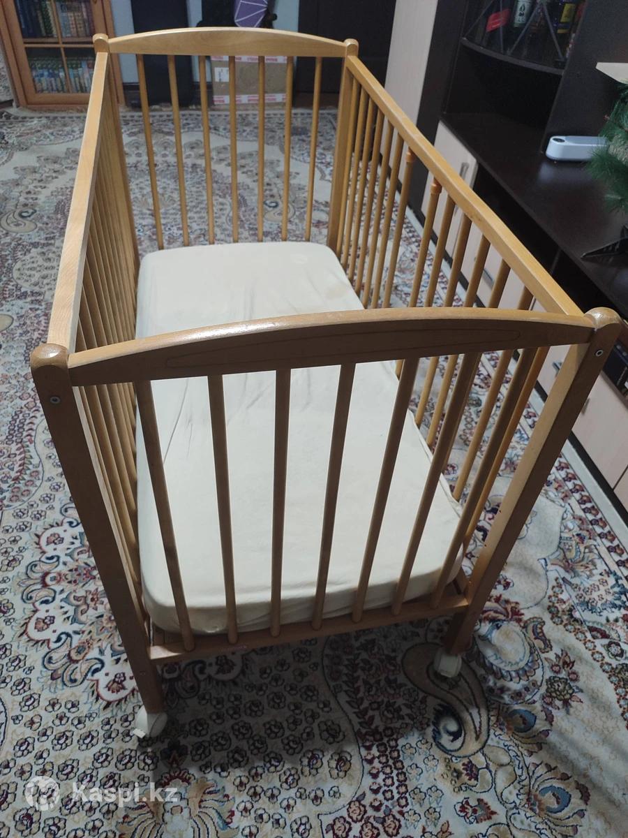 Деревянный манеж, б/у, Франция, детальное описание можно посмотреть на сайте нижняя часть ставится в 4 положения, продаётся вместе с матрасем и наматрасником, с передней стороны нет одной палки из 15, по опыту не критично. Новый стоит 200 евро у производителя. Легко катается, со стопорами.