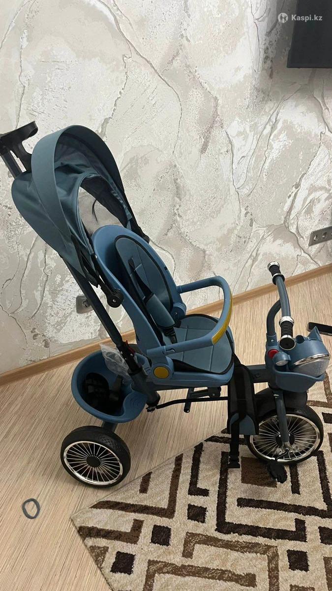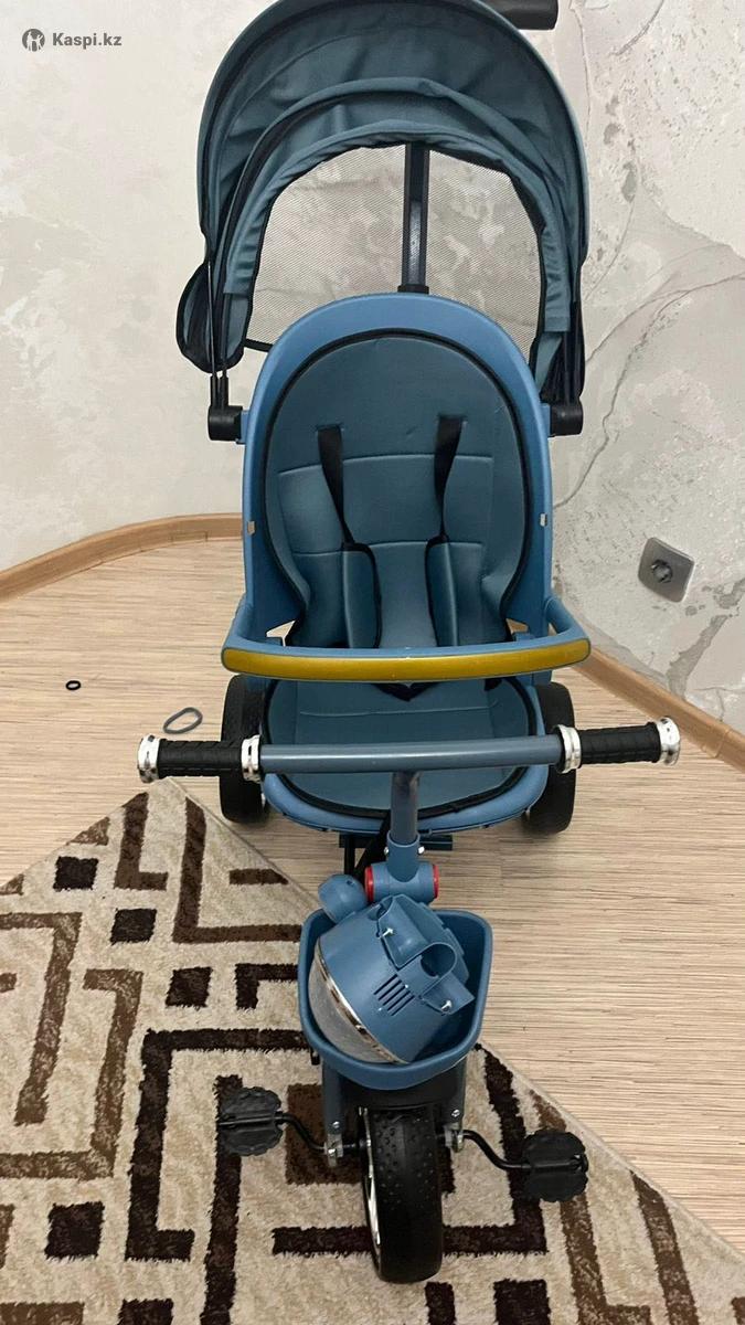 Трехколесный велосипед для детей. Можно поменять положение сидении и ребенок может спокойно спать . Сидение опускается на 3 положении и поворачивается на 360 градусов. Складывается. Есть рабочая фара и музыка( на фото не видно так как не полностью собрали). Обсалютно новая. Подарили но нам цвет не подходит.