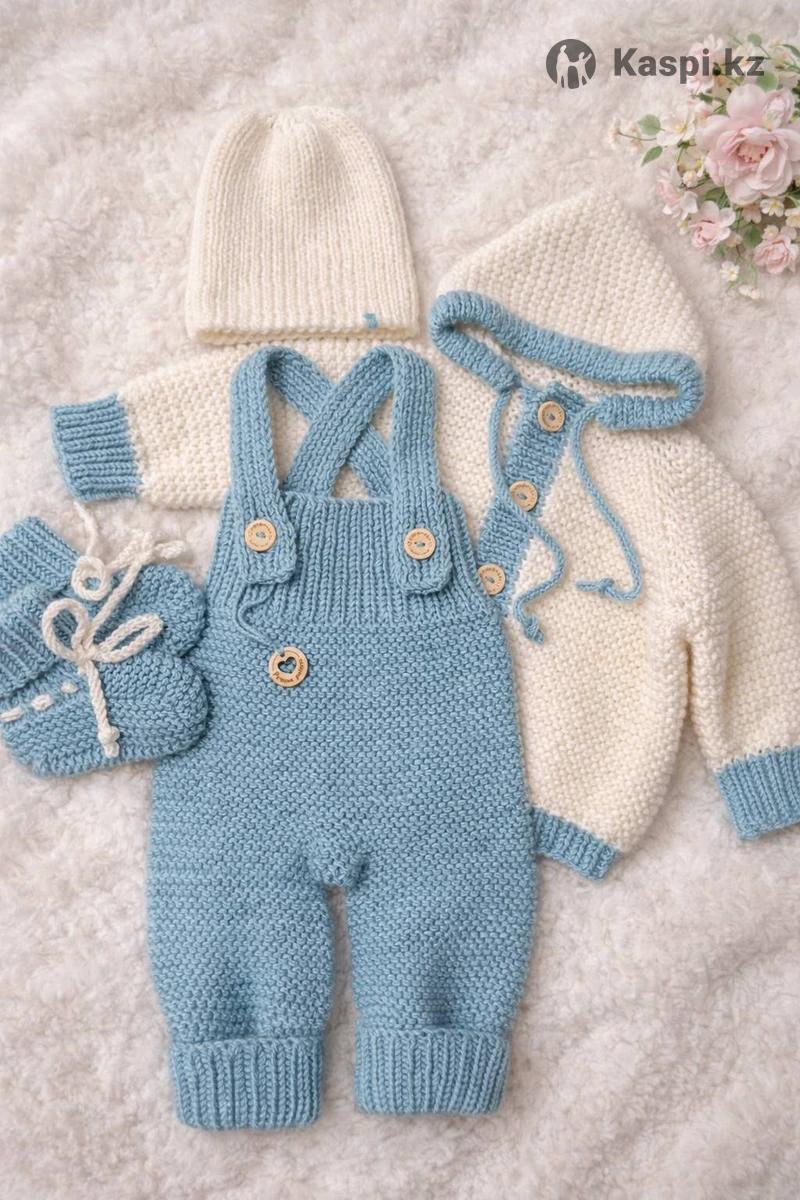 Детский теплый вязанный комплект. Пряжа с добавлением натуральной шерсти, без швов, что подарит вашему малышу не только тепло, но и свободу движения. Комплектация: штанишки с высокой посадкой на лямочках+кофточка+шапочка+пинетки. Размер 3-6мес. Ручная работа.