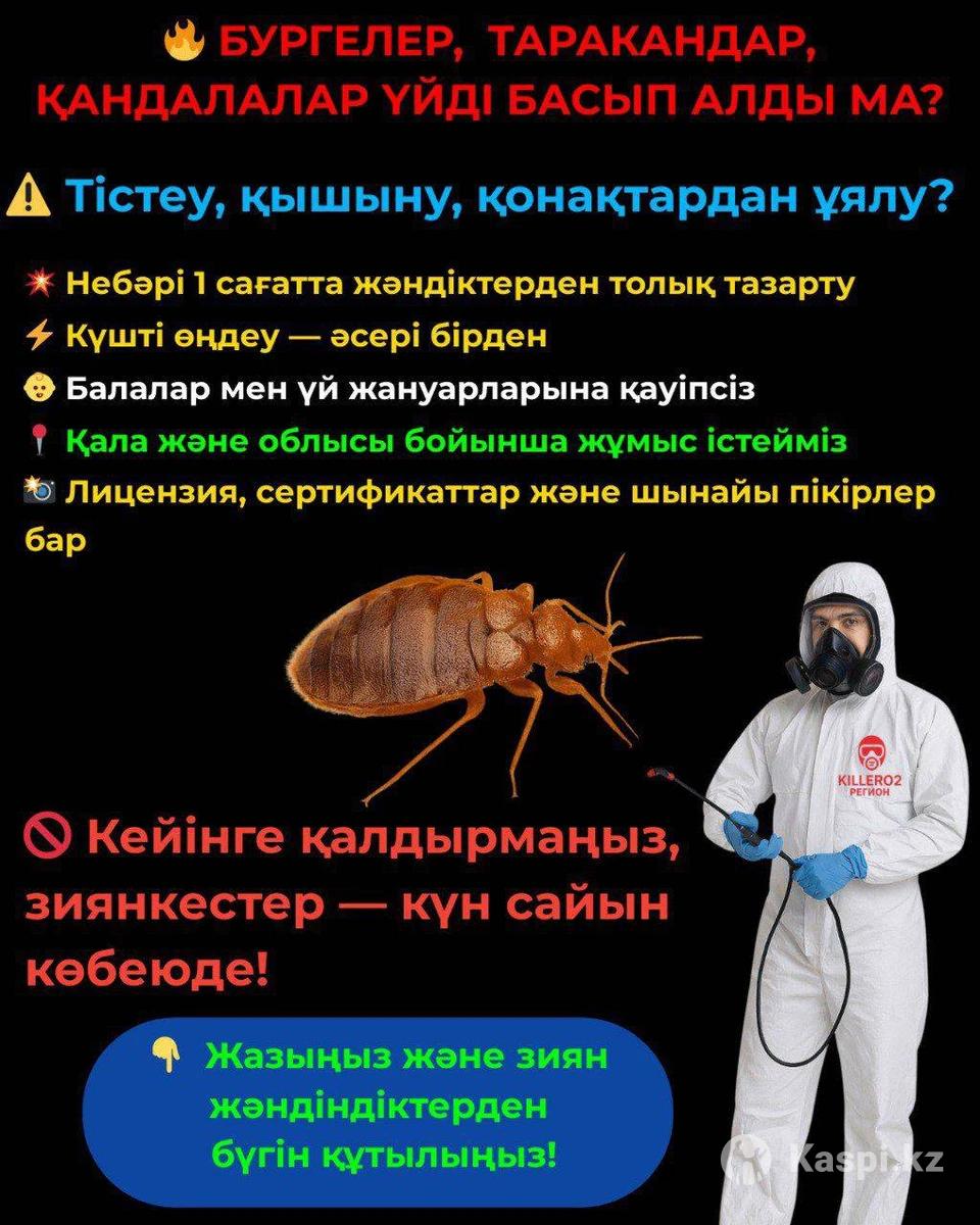 Уничтожение клопов, тараканов, мышей и крыс. Работаем с гарантией. Лицензия номер KZ30LAM00001599 от 14 апреля 2025г. Выдано : Департамент Сан-Эпид контроля г.Алматы.Заключение договоров . Работаем с физическими и юридическими лицами. Опыт более 10лет. Работаем по городу и по области. - Дератизация (уничтожение грызунов) - Дезинфекция (уничтожение микроорганизмов) - Дезинсекция( уничтожение насекомых) - Обработка территорий от клещей Обработка домов,квартир,бытовок, общежитий, хостелов, производственных помещений,государственных учреждений,офисов,складов и т.д. Уничтожение клопов Уничтожение тараканов Уничтожение блох Уничтожение клещей Уничтожение муравьев Уничтожение уховертки Уничтожение медведки Уничтожение постельных клещей Уничтожение пауков Уничтожение комаров Уничтожение чешуйниц Уничтожение моли Уничтожение короедов Уничтожение мокриц Уничтожение кожеедов Уничтожение ос Уничтожение шершней Уничтожение мукоедов Уничтожение сколопендр Уничтожение мошки Уничтожение шашелей Уничтожение насекомых Уничтожение грызунов Уничтожение мышей Уничтожение крыс Дезинфекция Обработка холодным туманом Фумигация Дезинсекция Обработка сухим туманом Дератизация Обработка от сорняков Обработка от тли Обработка деревьев от болезней Обработка от колорадских жуков Обработка участка Обработка лесопарка