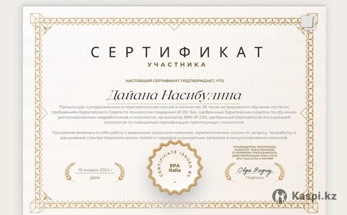 Здравствуйте! Меня зовут Насибулина Дайана. Я дипломированный психолог. работаю в научном подходе. Помогаю людям, которые устали “держаться” и хотят разобраться в себе глубже: снизить тревогу, наладить границы, прожить сложные чувства, выйти из самокритики и вернуться к опоре на себя. В работе мне важны бережность и ясность. Без давления, без стыда, без “соберись”. С уважением к вашему темпу, к вашему опыту. Рассматриваем что с вами происходило, и выстраиваем новые способы справляться, жить и выбирать. С чем ко мне можно прийти •тревожность, внутреннее напряжение, панические реакции •эмоциональное выгорание, усталость, ощущение “я не вывожу” •сложности в отношениях: обиды, конфликты, холод/дистанция, зависимость, страх близости •низкая самооценка, стыд, вина, самокритика, перфекционизм •травматический опыт, последствия насилия, тяжелые воспоминания (в безопасном темпе) •границы: “не умею отказать”, “все тащу на себе”, “меня используют” •кризисы: развод/измена/потеря, переезд, смена роли, материнство •повторяющиеся сценарии: выбираю “не тех”, проваливаюсь в контроль, избегаю, замираю Как я работаю Я использую интегративный подход: сочетаю современные методы психотерапии и понятную структуру. На встречах мы: •уточняем запрос и цели, чтобы вы понимали, “куда мы идем” •учимся замечать и регулировать состояние тела и нервной системы •разбираем мысли/убеждения, которые держат вас в тревоге и самокритике •исследуем внутренние “части” и защитные стратегии (чтобы перестать с собои воевать) •постепенно укрепляем опору, границы и навыки самоподдержки Формат •Индивидуальные консультации онлайн (видео/аудио) •Длительность: 50–60 минут •Работа возможна как точечно (1–3 встречи), так и в формате сопровождения Важно Я не ставлю диагнозы и не назначаю медикаменты. Психологическая работа не заменяет психиатра/невролога, но может быть мощной поддержкой в восстановлении, стабилизации и личных изменениях.