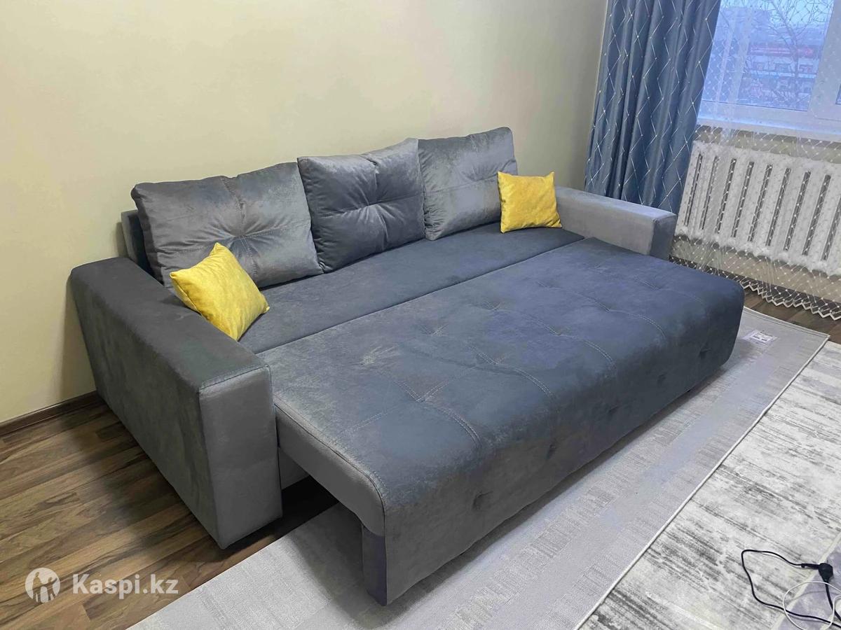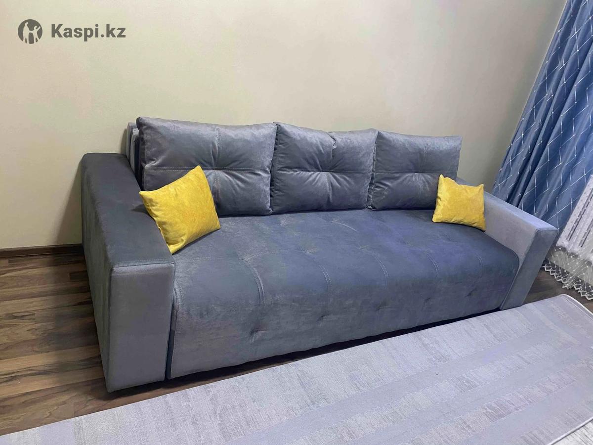 В хорошем состояний диван, выдвижной, без царапин и пятен, без запаха, с двумя желтыми подушками, внизу полки большие для хранения.