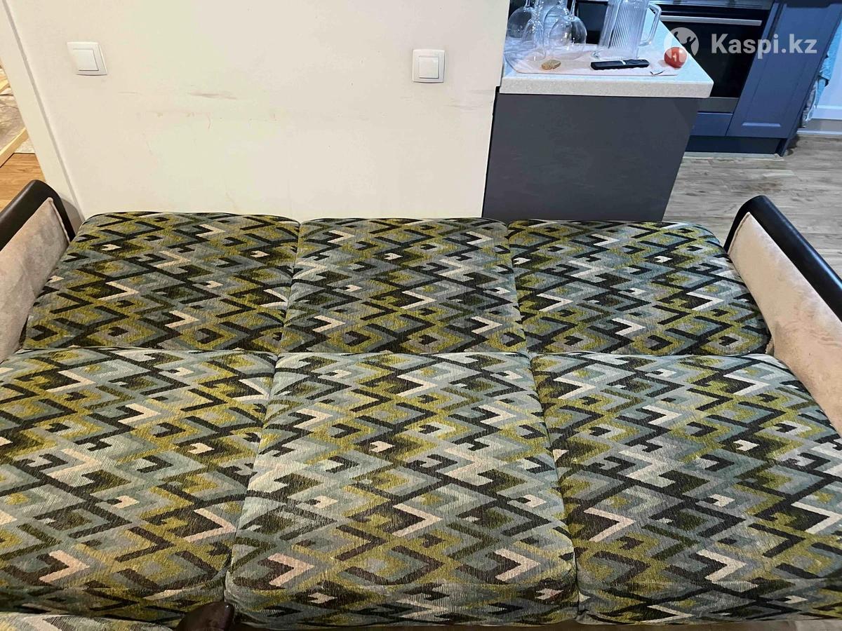 Комплект мебели: диван + кресло в этно-стиле Раскладывается механизм «книжка» Продаю удобный диван и кресло в одинаковом дизайне. •Диван: 200×60 см •Кресло: 70×50 см •Обивка: плотная износостойкая ткань с геометрическим узором в зелено-сине-желтой гамме •Каркас и подлокотники из темного дерева •У дивана есть вместительный выдвижной ящик для хранения Мебель в хорошем состоянии, устойчивая, комфортная и стильная. Подойдет для гостиной, кабинета или дачи.
