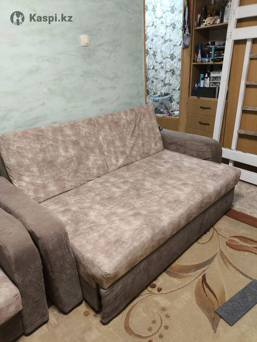 Диван раскладной. В собранном виде 190-90, в разобранном 160-200. Основа дерево, обивка велюр. Немного подлокотники поцарапаны котом.