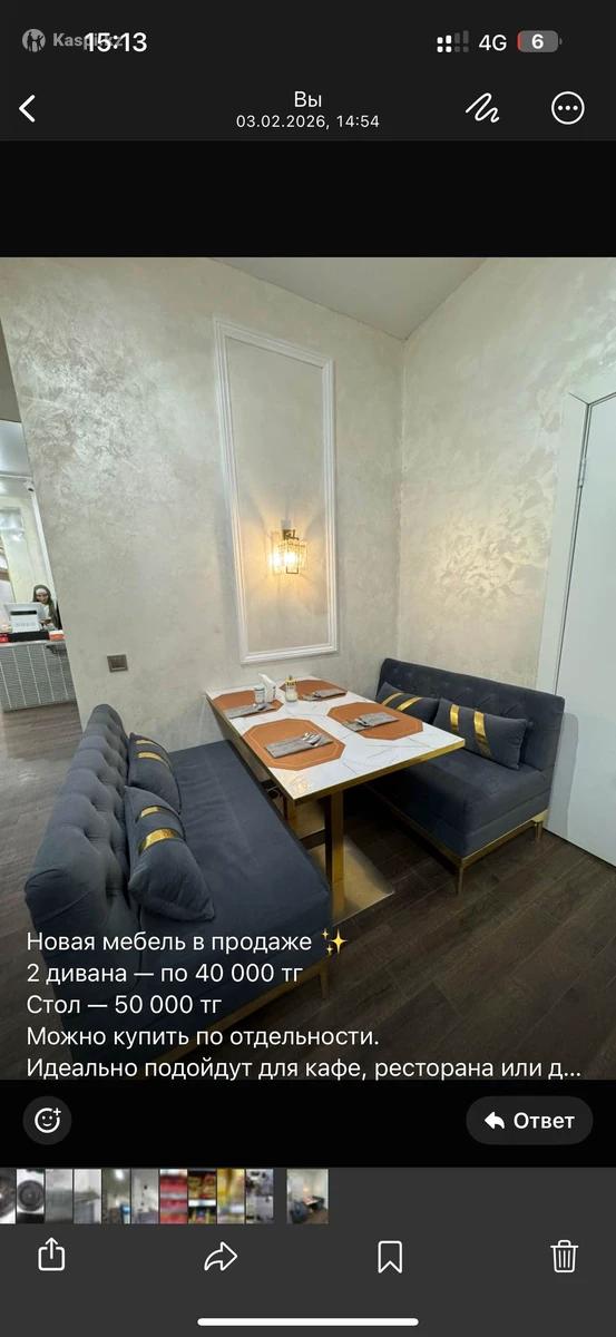 Новая мебель в продаже 2 дивана — по 40 000 тг Стол — 50 000 тг Можно купить по отдельности. Идеально подойдут для кафе, ресторана или дома.
