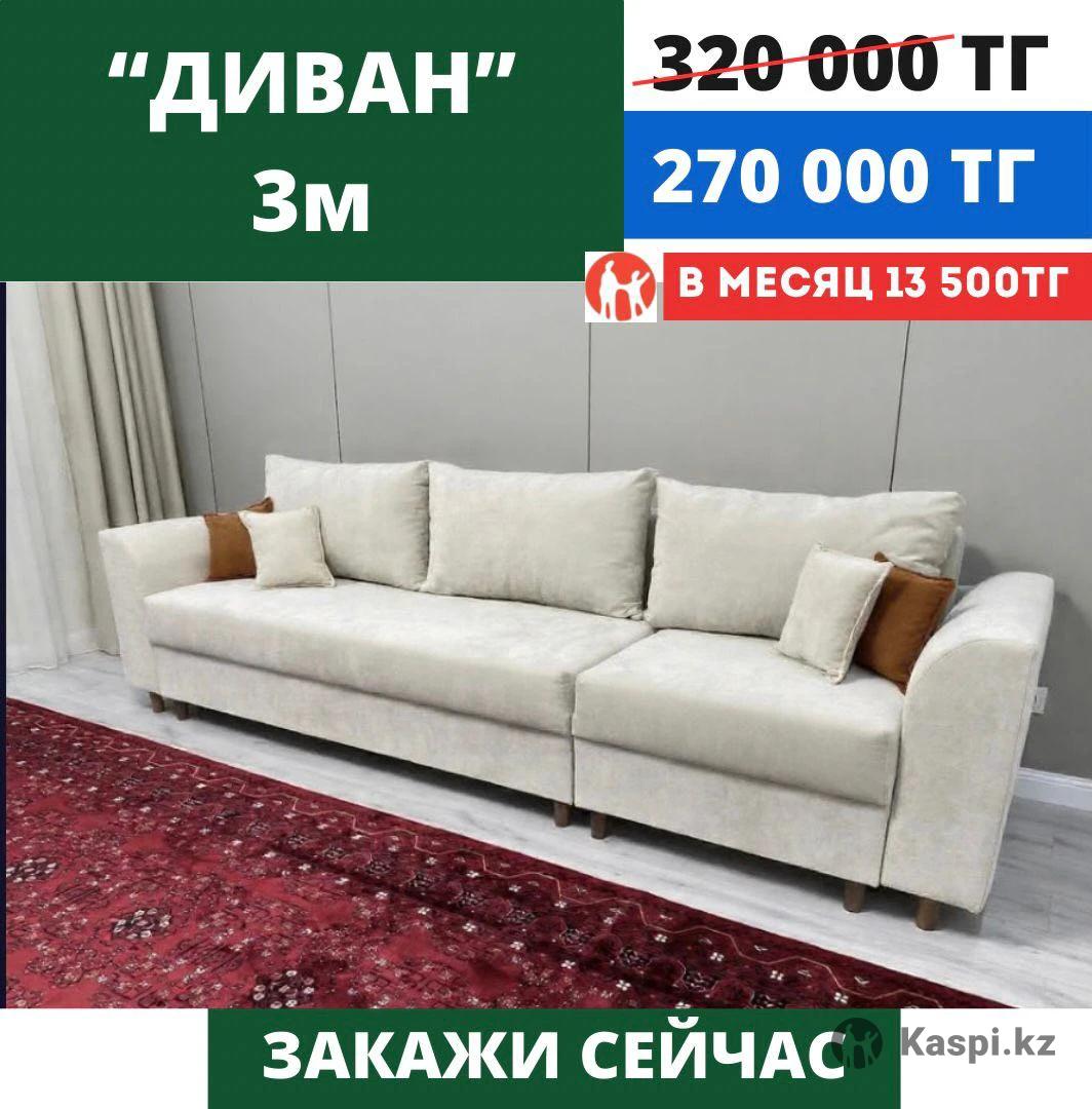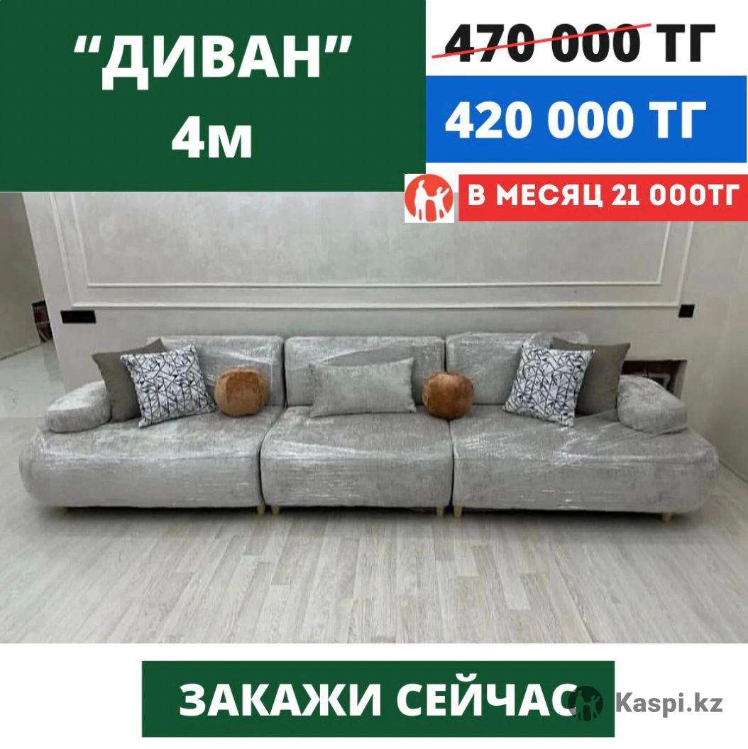 Уважаемые клиенты! Цены временные, по АКЦИИ! Успейте приобрести по оптовым ценам диваны прямо с цеха! Для заказа нужно отправить: 1.Фотографию дивана 2.Наполнитель 3.Механизм 4.Размер 5.Адрес проживания, куда нужно доставить мебель. 6.Контактный телефон и имя. 7. Предоплату 10.000тг, остаток на доставке Заранее спасибо! Доставка по Алматы бесплатная до подъезда, подъем платный. Онлайн заказы 24/7 Instagram: