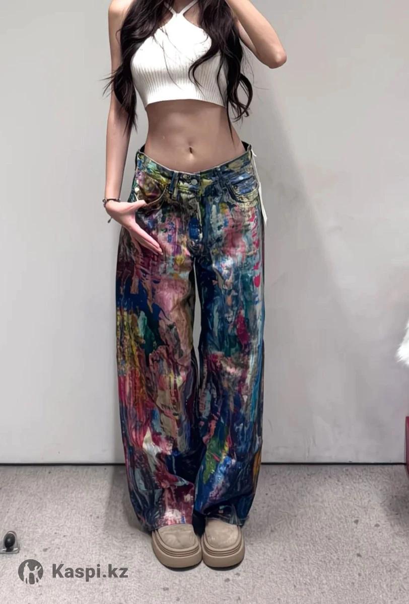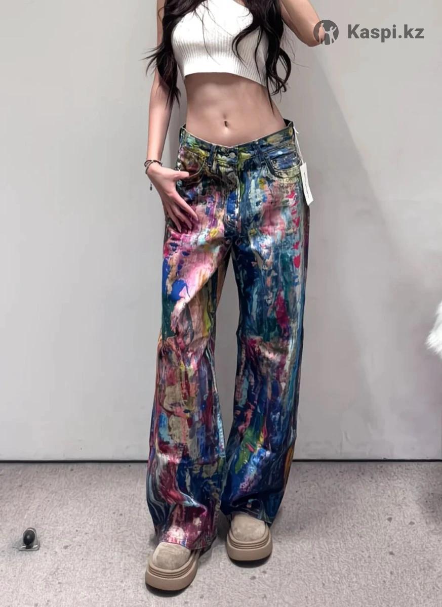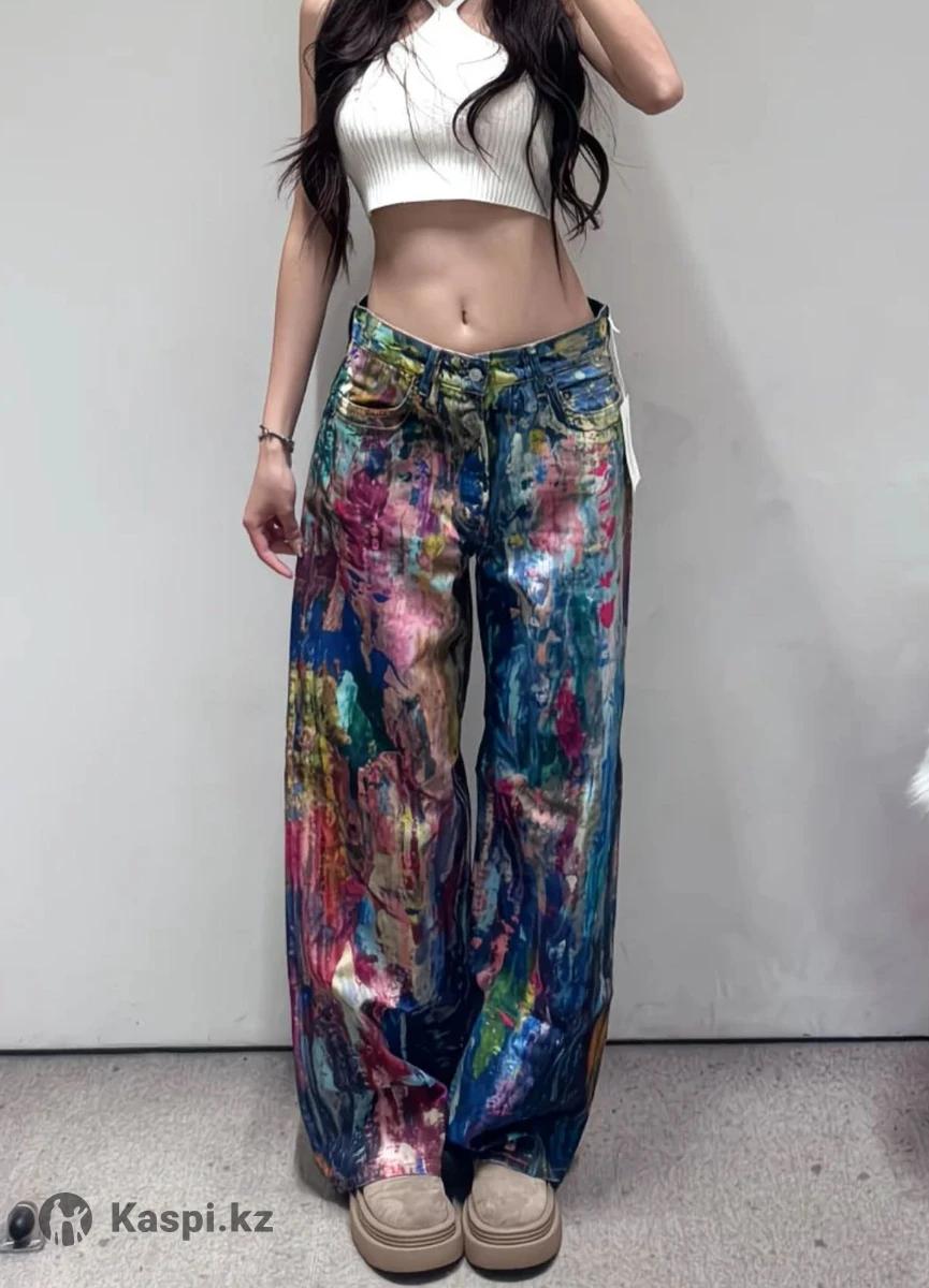 Джинсы-трубы с уникальным принтом, имитирующим всплески разноцветных красок. Новые, с биркой. Идеальная база для создания модного лука с творческим характером. Размер на этикетке указан XL, в реале на М и рост 168 будет смотреться как на модели. На фото кажется, что джинсы блестят - это свет так падает, на самом деле джинсы матовые.
