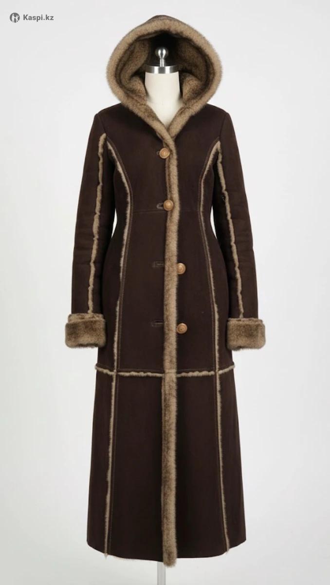 На этих изображениях представлена женская приталенная дубленка шоколадного цвета. Основные характеристики изделия: Материал и отделка: Дубленка выполнена из натуральной замши с отделкой из волчьего меха на капюшоне, манжетах и вдоль швов. Фасон: Модель имеет выраженный приталенный силуэт и длину макси. Детали: Изделие дополнено глубоким меховым капюшоном и декоративными пуговицами в форме полумесяца горчичного цвета. Дизайн: Внешние швы подчеркнуты светлым мехом в стиле пэчворк, что создает графичный и современный образ. Эти фотографии подготовлены специально для продажи, чтобы продемонстрировать как общий вид вещи на модели в городской среде, так и детальные ракурсы фурнитуры и кроя.