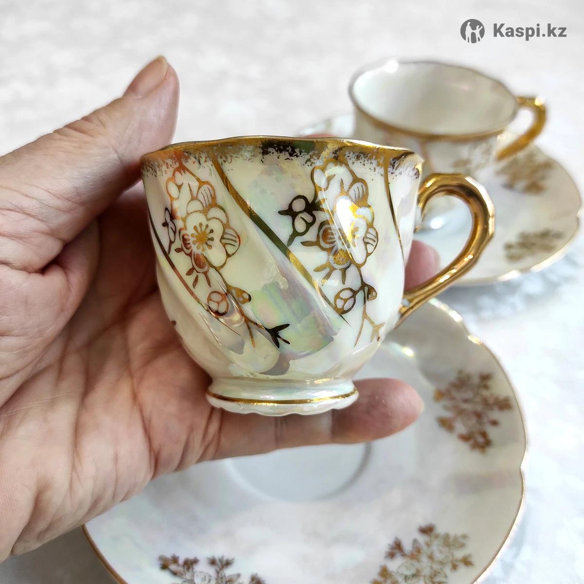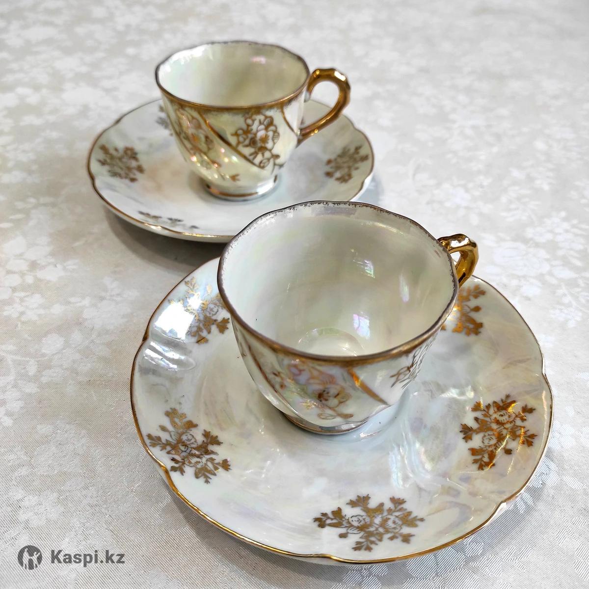 Изумительные две пары винтажных кофейных чашек из тончайшего костяного фарфора люстрового перламутрового покрытия с золотом Высота чашек 4.5 см, диаметр 6 см Диаметр блюдца 13 см Без следов пользования, в идеальном состоянии