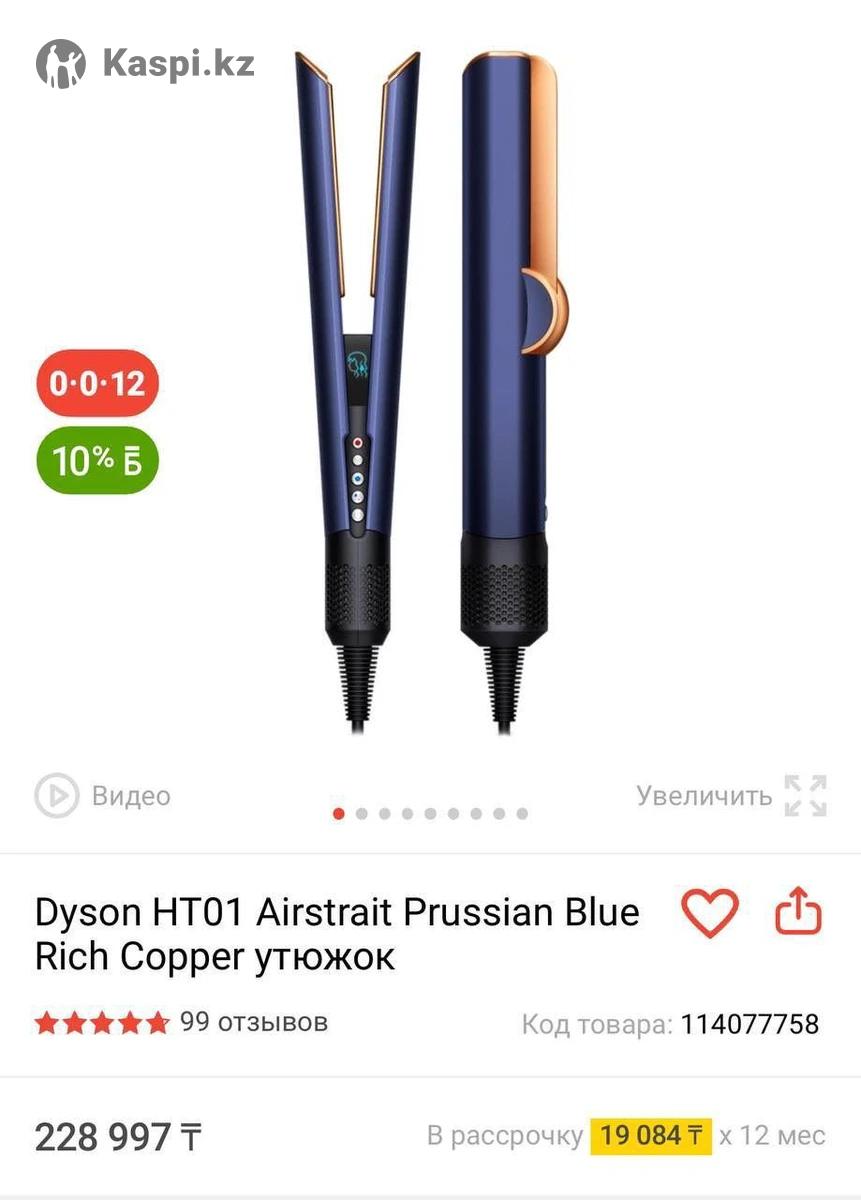 Міне, тауар туралы қысқаша сипаттама: --- 💨 Dyson HT01 Airstrait Prussian Blue | Утюжок для волос Цвет: Синий с медным акцентом (Rich Copper) 🔹 Безнагревной выпрямитель — сушка и выпрямление одновременно 🔹 Подходит для любого типа волос 🔹 Умный экран и 4 режима работы 🔹 Без вреда для структуры волос 💰 120.000