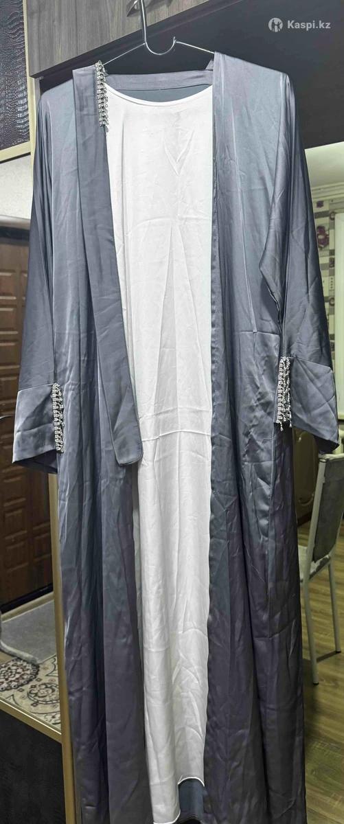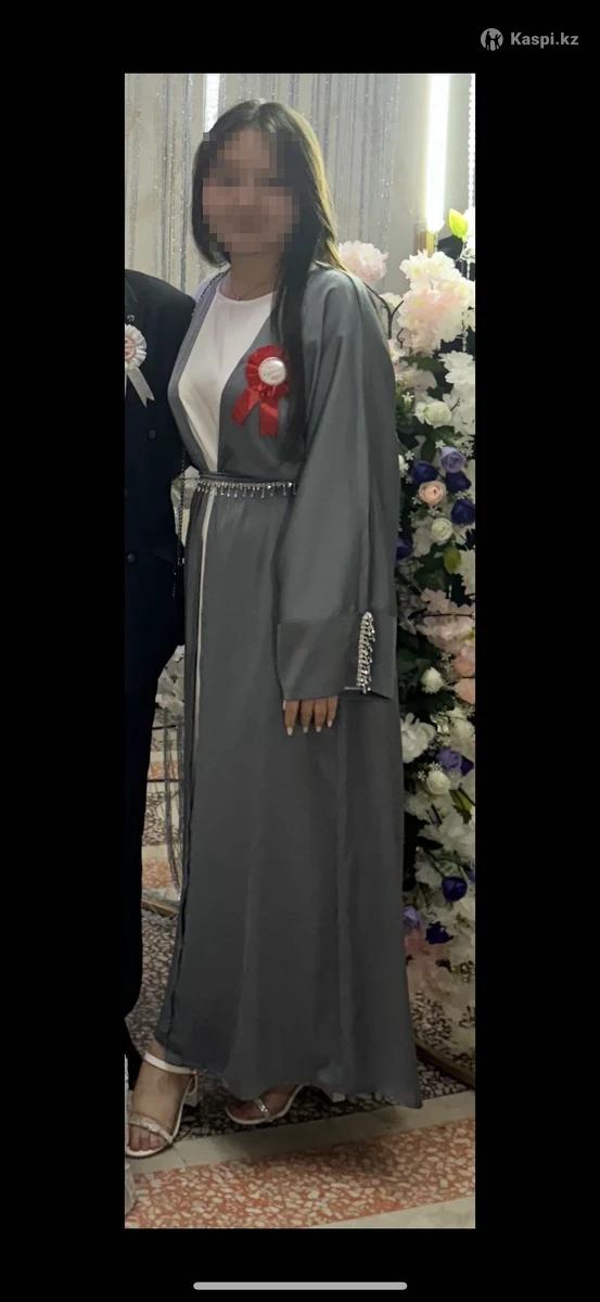 Элегантная вечерняя абайка, размер 46-48 🌟 Подчеркни свою талию и сияй на любом мероприятии! ✨ •Цвет: серый с белым внутри •Материал: лёгкий шифон •Акценты: камни и стразы на рукавах, стильный ремешок подчёркивает талию •Состояние: новая, одевалась только один раз