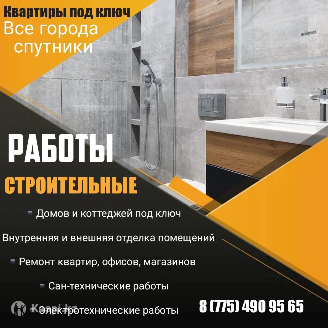 🏠Ремонт квартир под ключ🔐 ⚒️-Монтаж гибкого мрамора 🚿-Сантехника 💡-Электрика 🚪-Двери 🔧- -Пустил линолеума,ламината,паркета и тд. 🔧-Кладка плитки 🔧-Монтаж гипсокартона 🛠-Заливка полов 🛠-Выравние полов 🧱-Монтаж , демонтаж стен и перегородок 🛠-Заливка фундамента 🛠-Кровля 🔧-Монтаж теплого пола водяного и электрического 💡-Установка освещения 🧱-Возведение заборов любой сложности 🏘-Строительство бани и беседок 🏘-Реставрация жилых и не жилых помещений ❗️❗️❗️87754909565