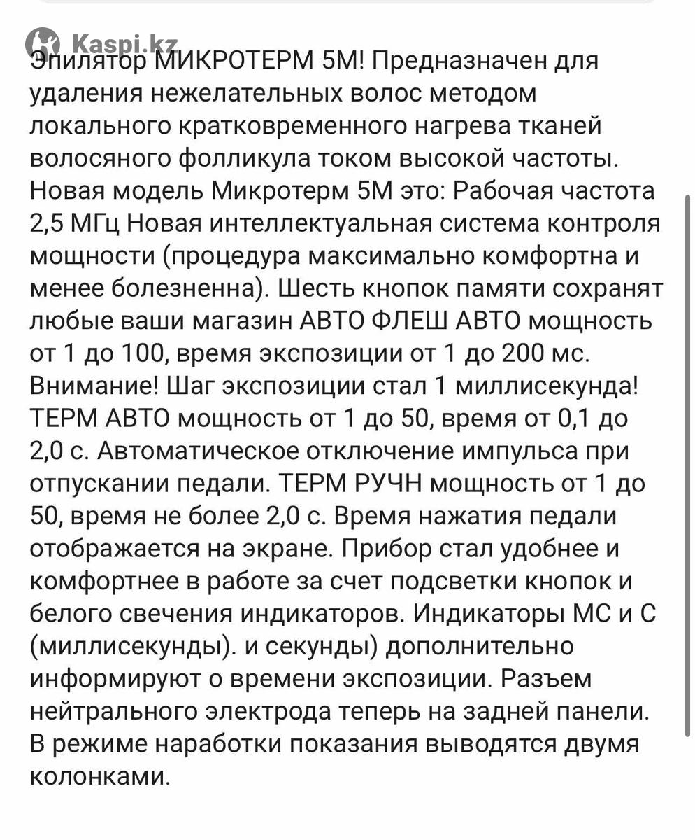 Эпилятор МИКРОТОРМ 5M! Предназначен для удаления нежелательных волос методом локального кратковременного нагрева тканей волосяного фолликула током высокой частоты. Новая модель Микротерм 5M это: Рабочая частота 2,5 МГц Новая интеллектуальная система контроля мощности (процедура максимально комфортна и менее болезненна). Шесть кнопок памяти сохранят любые ваши магазин АВТО ФЛЕШ АВТО мощность от 1 до 100, время экспозиции от 1 до 200 мс. Внимание! Шаг экспозиции стал 1 миллисекунда! ТЕРМ АВТО мощность от 1 до 50, время от 0,1 до 2,0 с. Автоматическое отключение импульса при отпускании педали. ТЕРМ РУЧН мощность от 1 до 50, время не более 2,0 с. Время нажатия педали отображается на экране. Прибор стал удобнее и комфортнее в работе за счет подсветки кнопок и белого свечения индикаторов. Индикаторы МС и С (миллисекунды). и секунды) дополнительно информируют о времени экспозиции. Разъем нейтрального электрода теперь на задней панели. В режиме наработки показания выводятся двумя колонками.