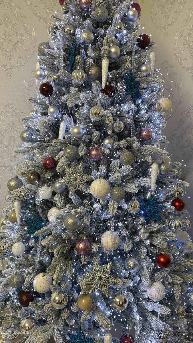 Новая елка с игрушками и с гирляндами. Выглядит очень богато