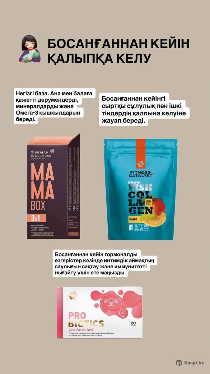 Mama Box: Негізгі база. Ана мен балаға қажетті дәрумендерді, минералдарды және Омега-3 қышқылдарын береді. Fish Collagen: Босанғаннан кейінгі сыртқы сұлулық пен ішкі тіндердің қалпына келуіне жауап береді. Терінің созылуын (растяжки) азайтуға, шаштың түсуін тоқтатуға және буындарды нығайтуға көмектеседі. Probiotics (Gynoflor): Әйелдердің денсаулығы мен микрофлорасын реттеуге арналған. Босанғаннан кейін гормоналды өзгерістер кезінде интимдік аймақтың саулығын сақтау және иммунитетті нығайту үшін өте маңызды.