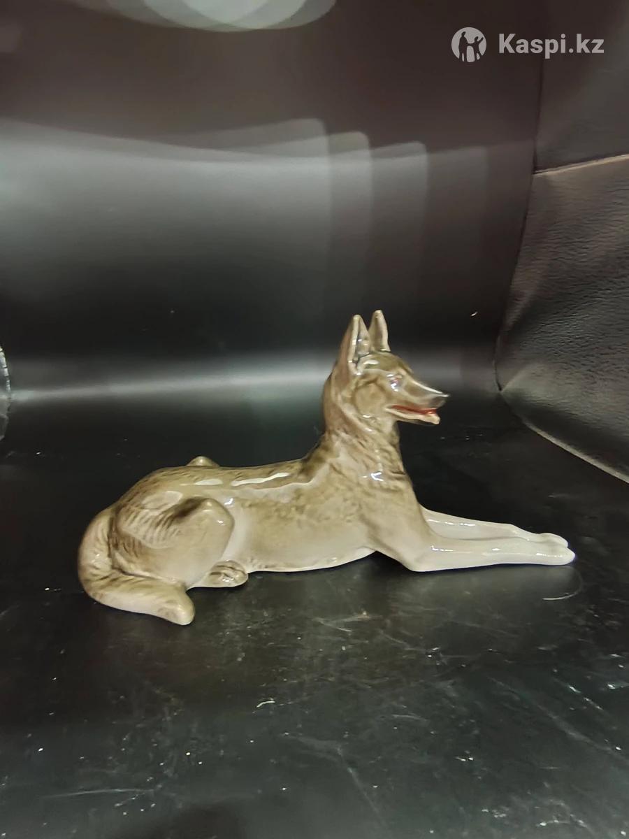 Фарфоровая статуэтка «Немецкая овчарка» Автор формы: Борис Яковлевич Воробьев (роспись: И. И. Ризнич) Завод: ЛФЗ (Ломоносовский фарфоровый завод), СССР Период выпуска: Модель — 1955 г.; выпуск — середина 1960-х гг. Материал: Фарфор, подглазурная художественная роспись Размер: (авторский вариант 18 см Состояние: без сколов/трещин