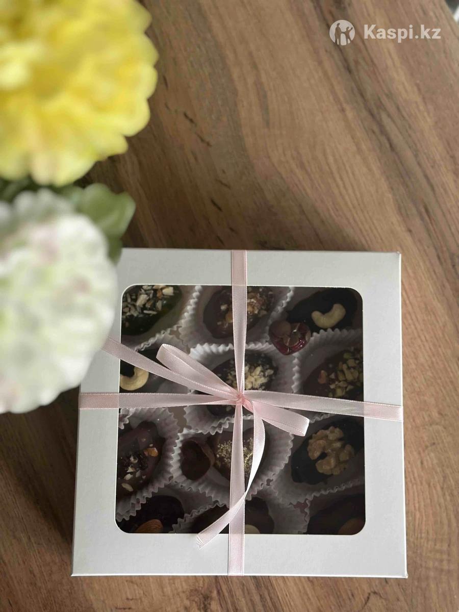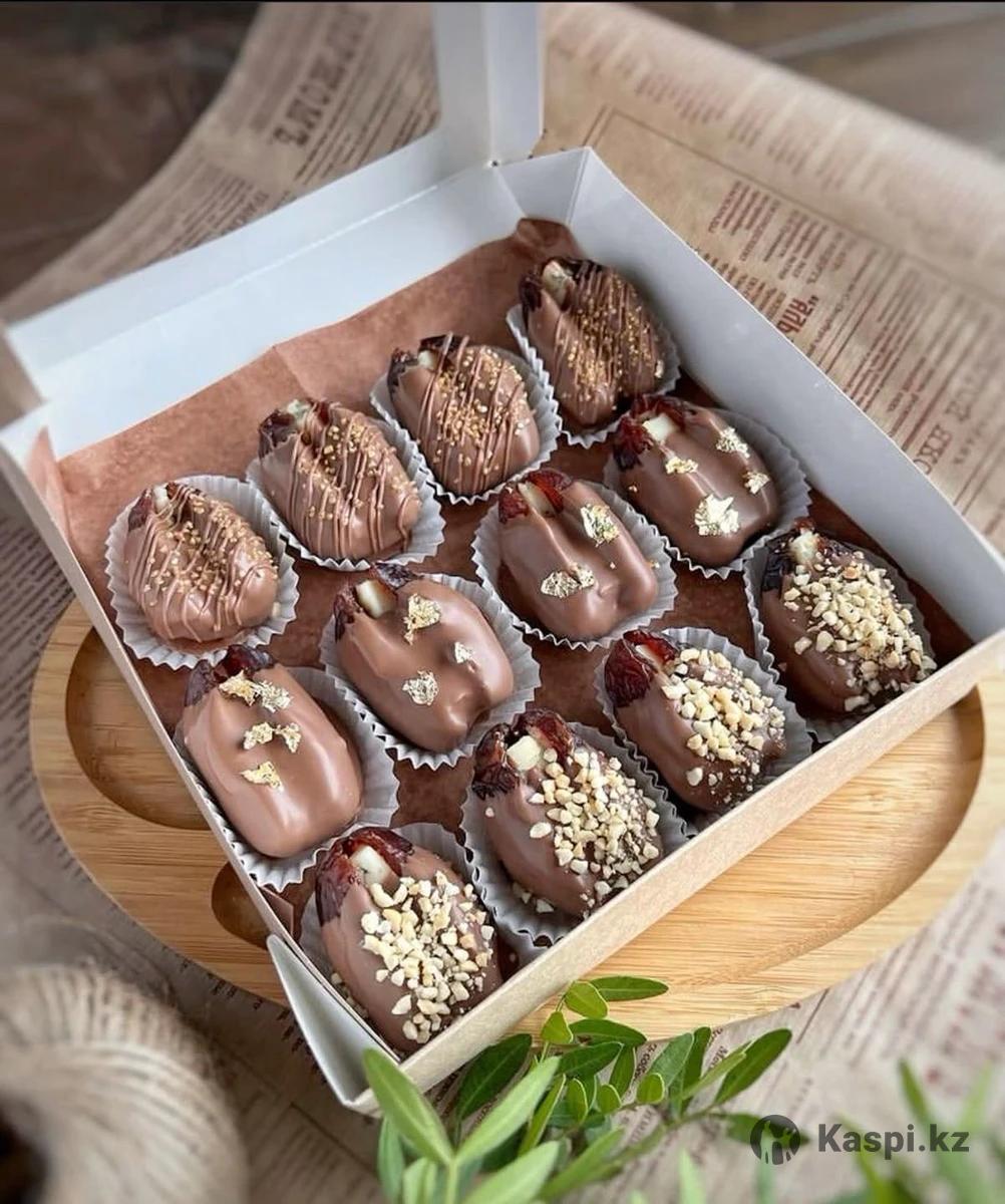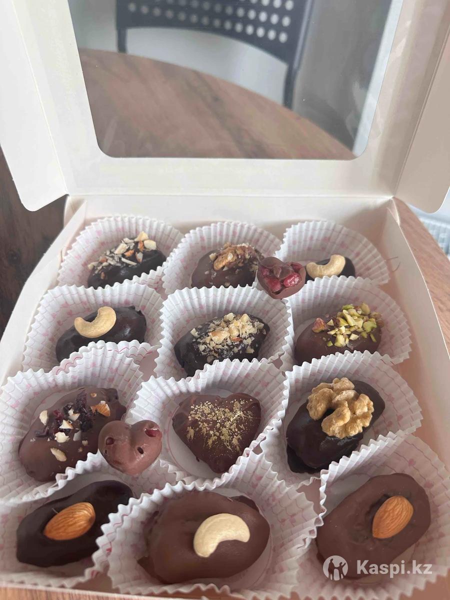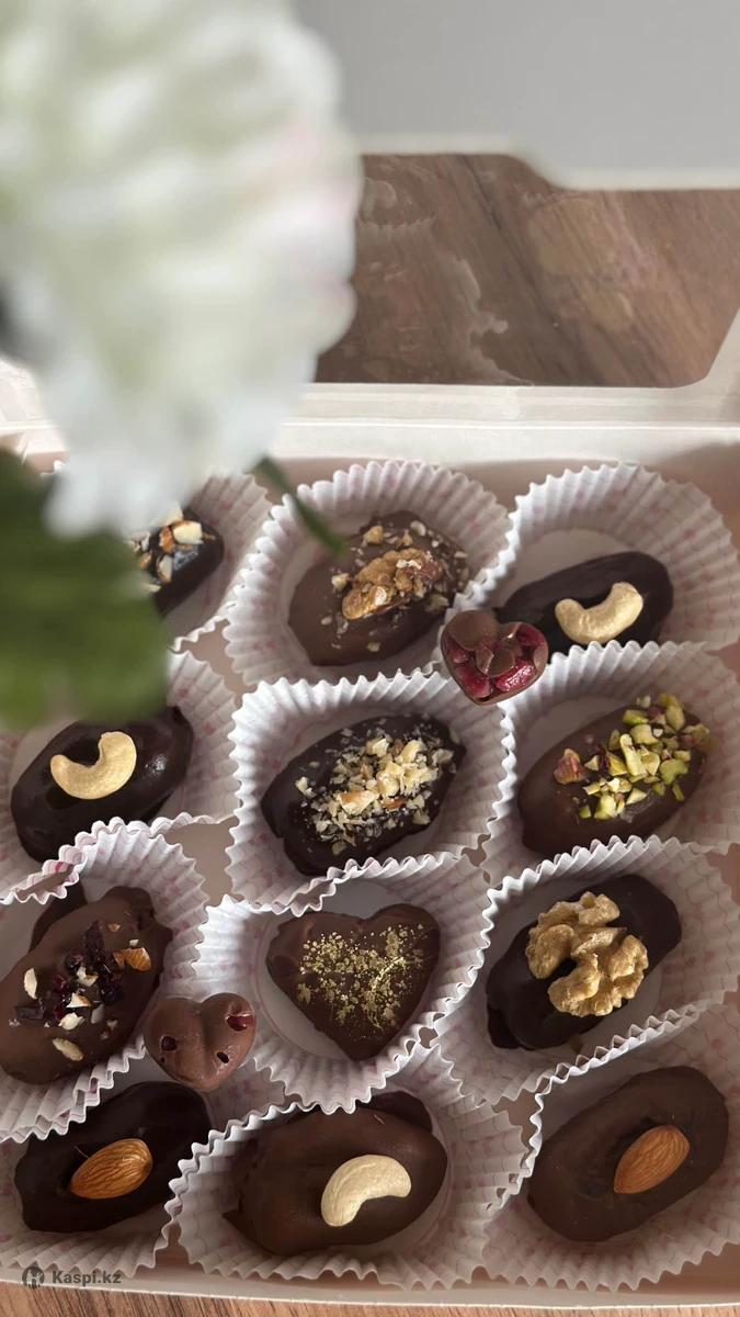 Принимаю заказы на королевские финики в бельгийском шоколаде. Внутри орехи на выбор: кешью, миндаль, фисташки, грецкий орех, арахисовая паста. Только натуральные и свежие продукты. Ручная работа. Есть доставка.