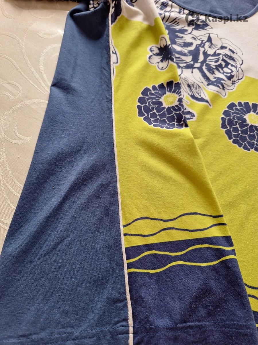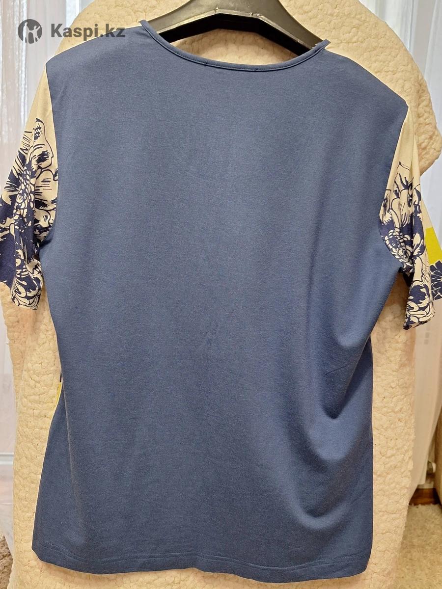 Футболка в отличном состоянии, не теряет форму после стирки. Растояние под проймой рукава 47 см. (передняя часть), ширина по нижнему краю футболки 49 см., длина плеча 12 см., длина рукава от плеча 24 см., ширина рукава по нижнему краю 31 см., длина футболки по центру спинки 58 см.