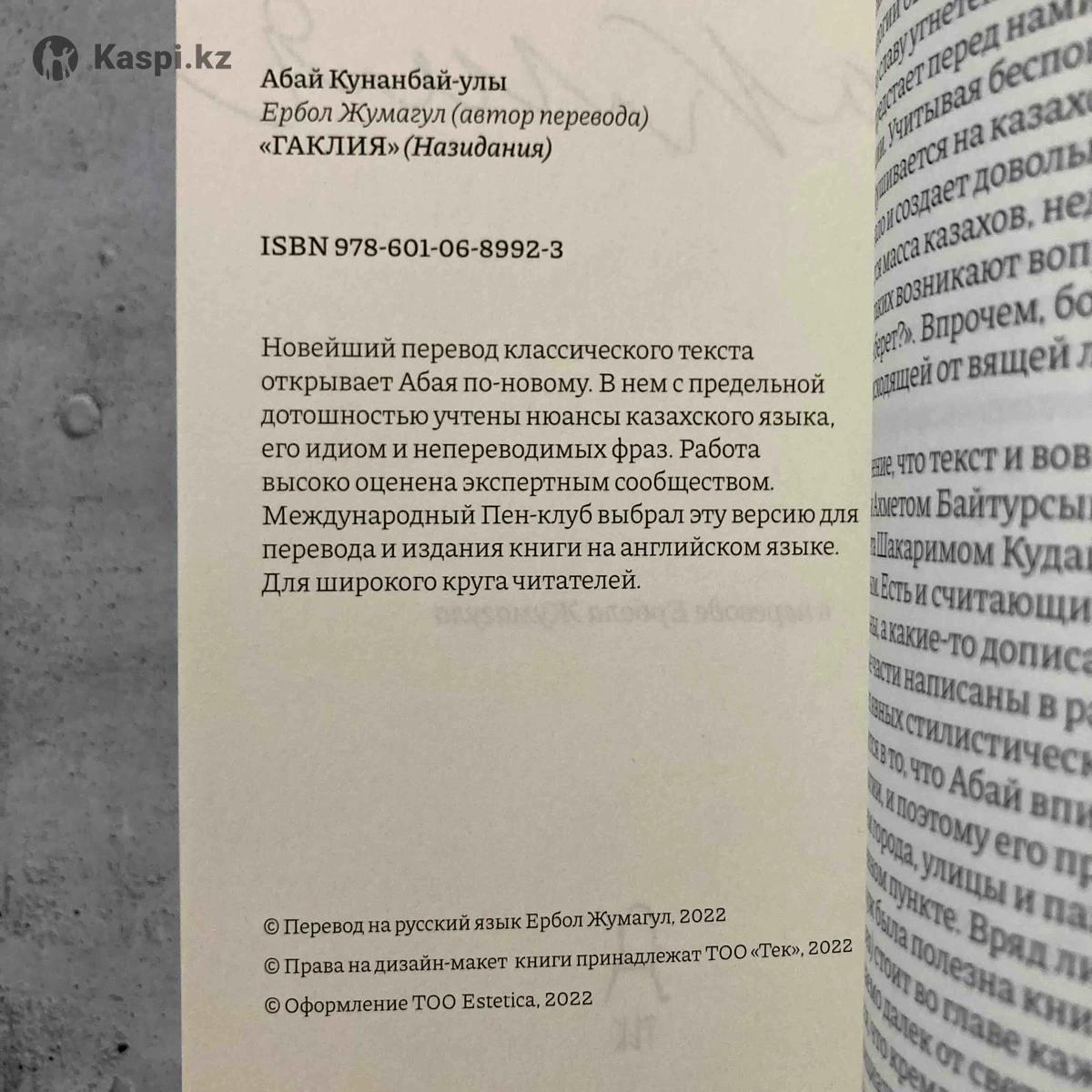 Гаклия / Ғақлия Абай Кунанбаев 2023 Книга, мягкая обложка В хорошем состоянии Новейший перевод классического текста открывает Абая по-новому. В нем с предельной дотошностью учтены нюансы казахского языка, его идиом и непереводимых фраз. Работа высоко оценена экспертным сообществом. Международный Пен-клуб выбрал данную версию для перевода и издания книги на английском языке. Издание-билингва, на русском и казахском языках