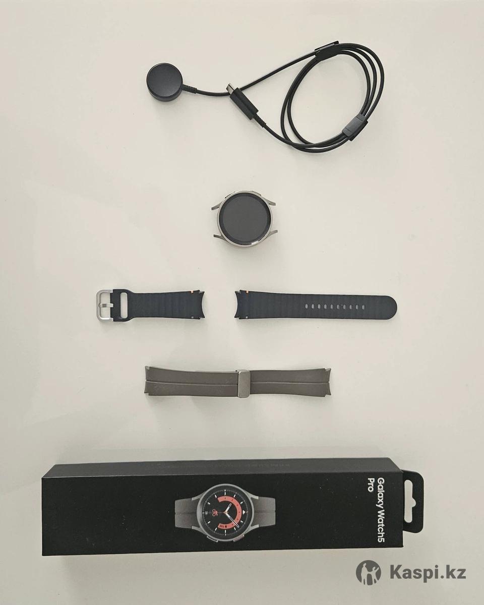 Samsung Galaxy Watch 5 Pro — топовая модель! Отличное состояние, полный комплект: Часы 2 ремешка (титановый и спортивный) Магнитная зарядка Коробка AMOLED 1.4", сапфировое стекло, титан, GPS, NFC, звонки, защита IP68. Батарея держит до 3 дней. Идеально для спорта и работы.