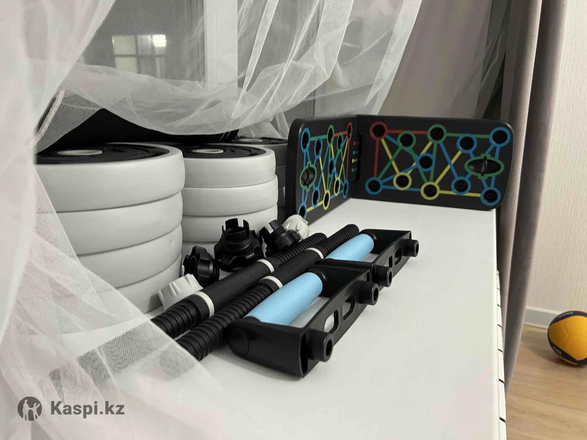 Продам набор гантели + рядом идет тренажер для разных мышц групп , из недостатков , нету упаковочного материала . Общий вес гантелей 19 кг .