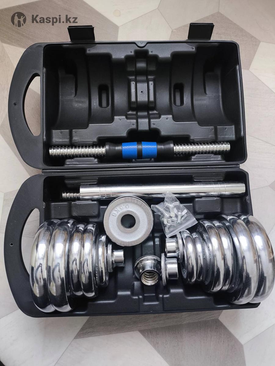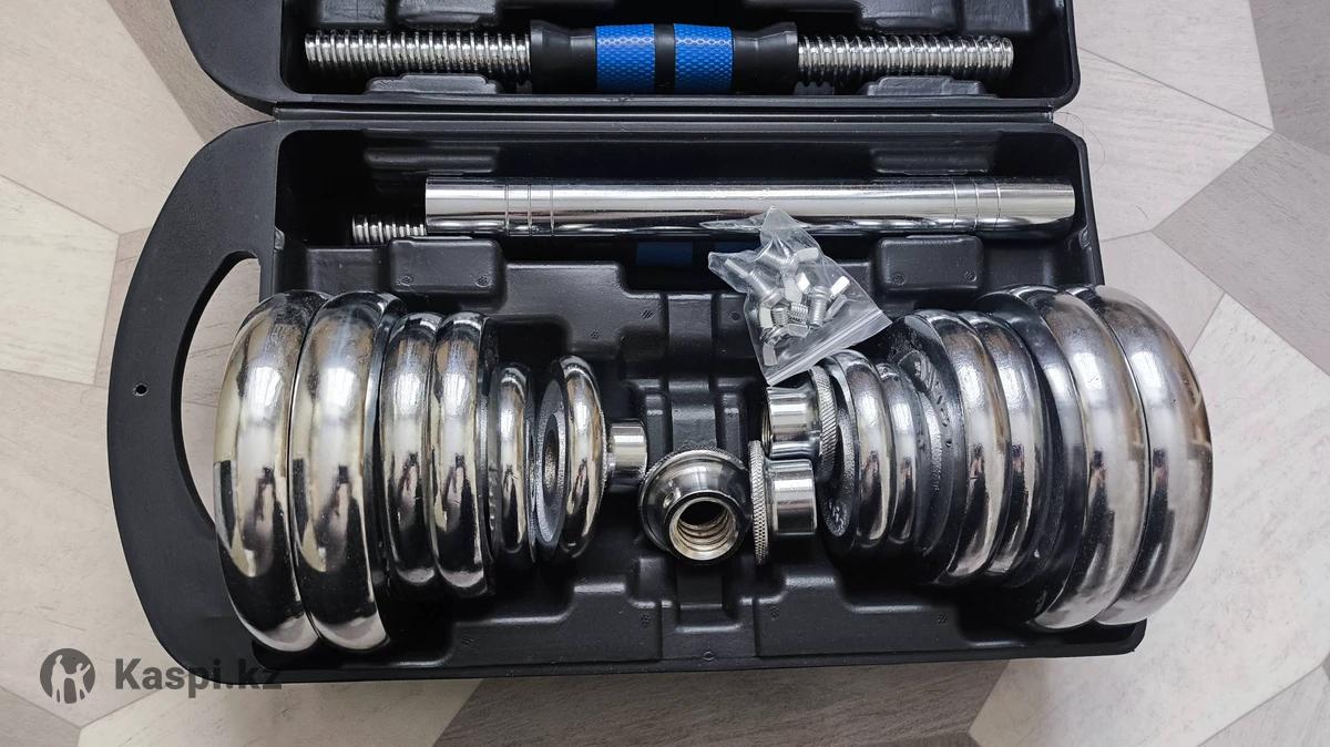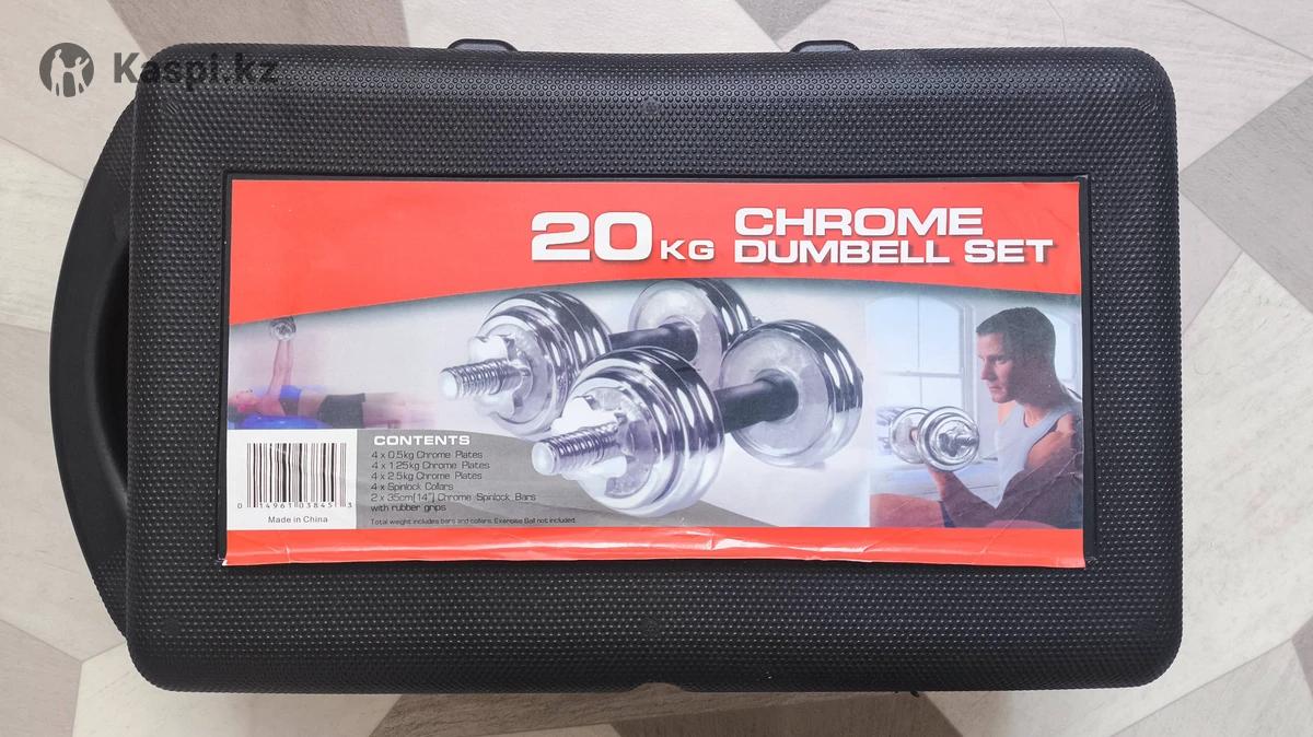 Хромированные гантели (масса 20 кг) Возможность собрать штангу Хромированные металлические блины 4 х 0.5 кг 4 х 1.25 кг 4 х 2.5 кг 4 х замка 2 х 35 см грифа 1 х соединитель грифов для штанги