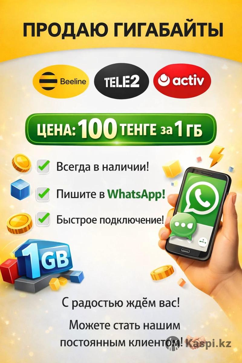 Продаю гигабайты для Beeline, Tele2, Activ. Что предлагаю: • Быстрая активация пакетов • Всегда в наличии (от 1 ГБ до 1000 ГБ) • Цена: 100 - 160 тг/ГБ • Работаем по всему Казахстану Как купить: 1. Выберите объем гигабайт 2. Укажите номер телефона 3. Оплата на Kaspi/Халыk 4. Активация в течение 10 минут Бонусы для постоянных клиентов. Пишите !
