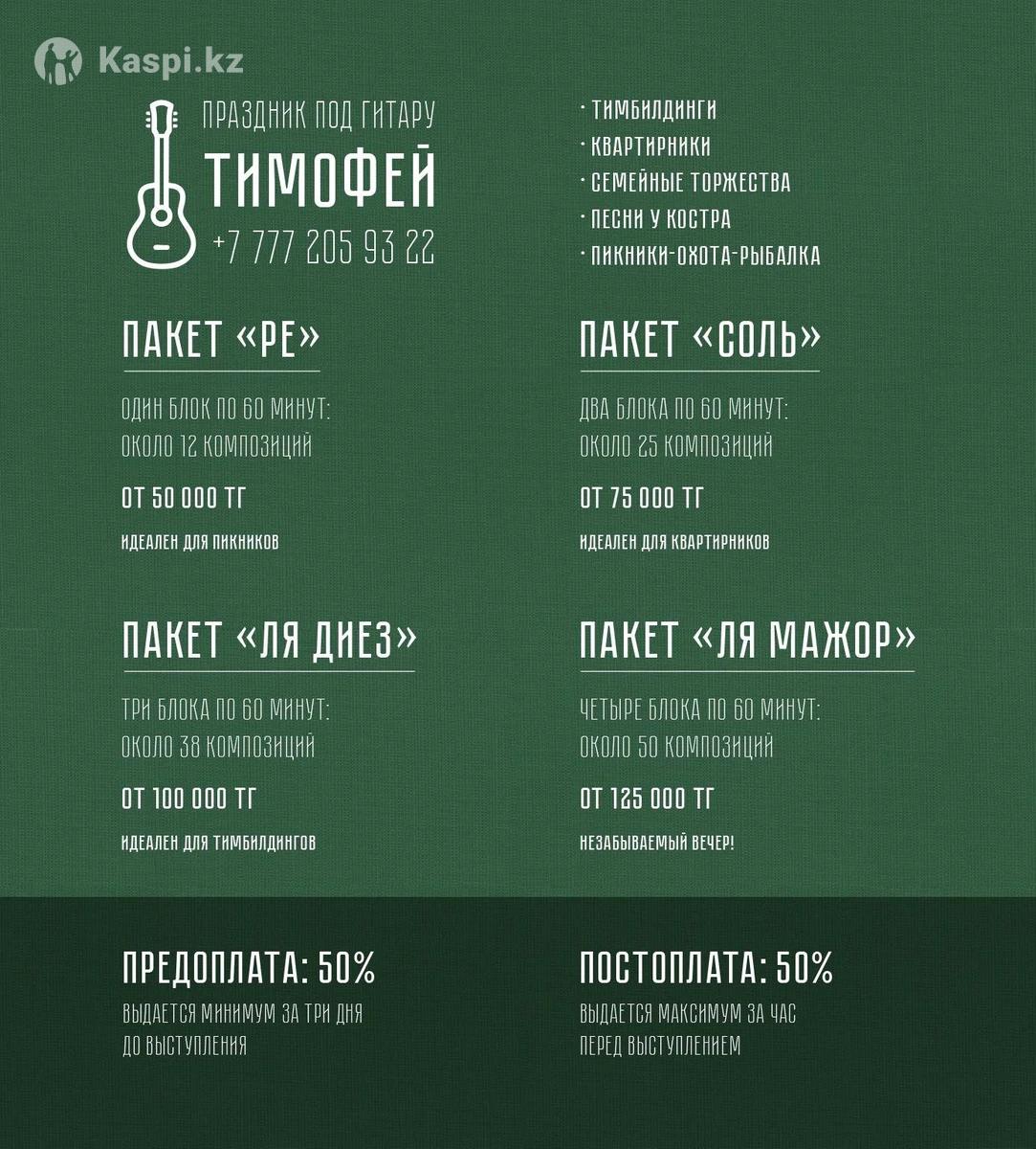Живая музыка: гитара + вокал Душевное музыкальное украшение ваших мероприятий от Тимофея: тимбилдинги, квартирники, семейные торжества и выезды на природу! Многолетний опыт, десятки довольных клиентов и тысячи часов выступлений - ваши гости запомнят этот вечер надолго! 1. Пакет "РЕ": Один блок по 60 минут - около 12 композиций (идеален для пикников) От 50 000 тг 2. Пакет "СОЛЬ": Два блока по 60 минут - около 25 композиций (идеален для квартирников) От 75 000 тг 3. Пакет "ЛЯ ДИЕЗ": Три блока по 60 минут - около 38 композиций (идеален для тимбилдингов) От 100 000 тг 4. Пакет "ЛЯ МАЖОР": Четыре блока по 60 минут - около 50 композиций (незабываемый вечер!) От 125 000 тг